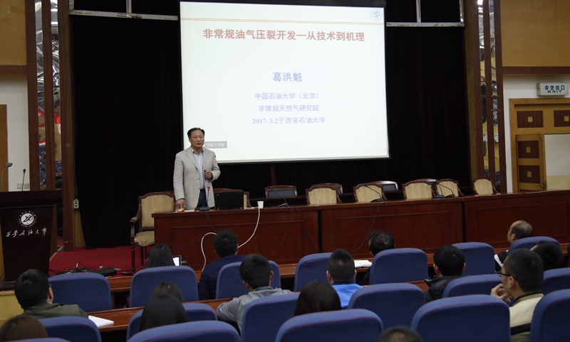 3月2日下午,中國(guó)石油大學(xué)(北京)二級(jí)教授葛洪魁在學(xué)術(shù)報(bào)告廳為我校師生作了題為《非常規(guī)油氣壓裂開(kāi)發(fā)——從技術(shù)到機(jī)理》的學(xué)術(shù)報(bào)告。李天太副校長(zhǎng)出席報(bào)告會(huì)??萍继庁?fù)責(zé)人及300余名師生聽(tīng)取了報(bào)告。