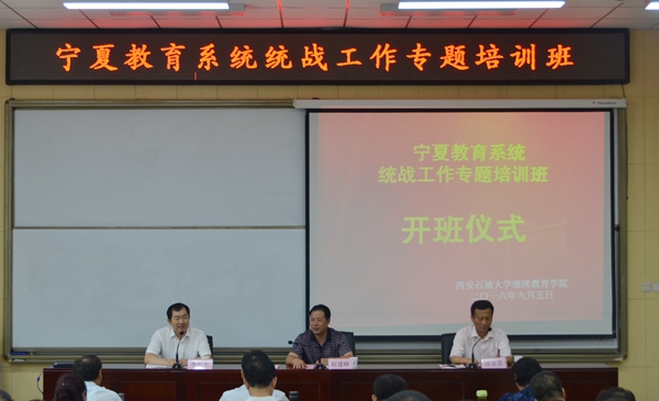 9月5日上午,由寧夏回族自治區(qū)教育工委主辦、我校繼續(xù)教育學(xué)院承辦的“寧夏教育系統(tǒng)統(tǒng)戰(zhàn)工作專題培訓(xùn)班”在南區(qū)培訓(xùn)中心舉行了開班儀式。寧夏教育工委副書記趙建峰、寧夏教育工委黨建工作部部長孫金忠,我校副校長李天太以及來自寧夏教育系統(tǒng)的50余名統(tǒng)戰(zhàn)干部參加了開班儀式。