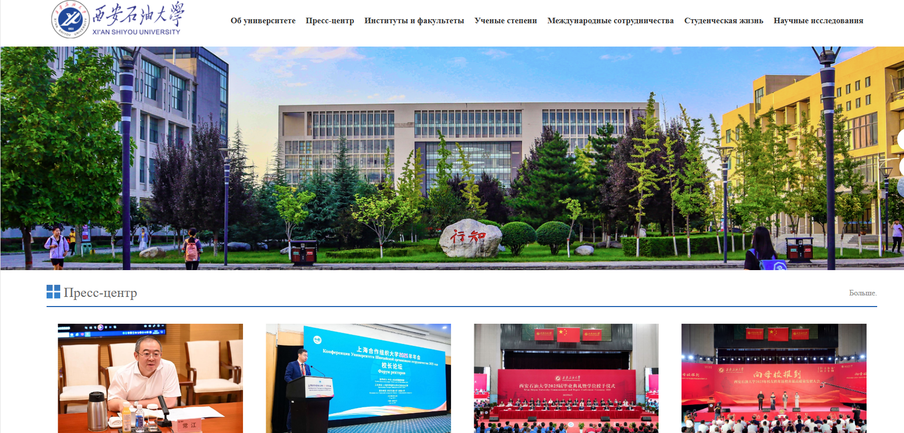 俄文主頁聚焦學(xué)校核心發(fā)展成果,開設(shè)學(xué)校概況(об университете)、新聞中心(Пресс-центр)、院系介紹(Институты и факультеты)、學(xué)術(shù)學(xué)位(Ученые степени)、國(guó)際合作(Международные сотрудничества)、校園生活(Студенческая жизнь)、科學(xué)研究(Научные исследования)等特色板塊,系統(tǒng)呈現(xiàn)學(xué)校在人才培養(yǎng)、科學(xué)研究、社會(huì)服務(wù)等方面的綜合實(shí)力,尤其突出國(guó)際化辦學(xué)的鮮明特色與豐碩成果,為俄語世界打開一扇了解西石大的全新窗口。