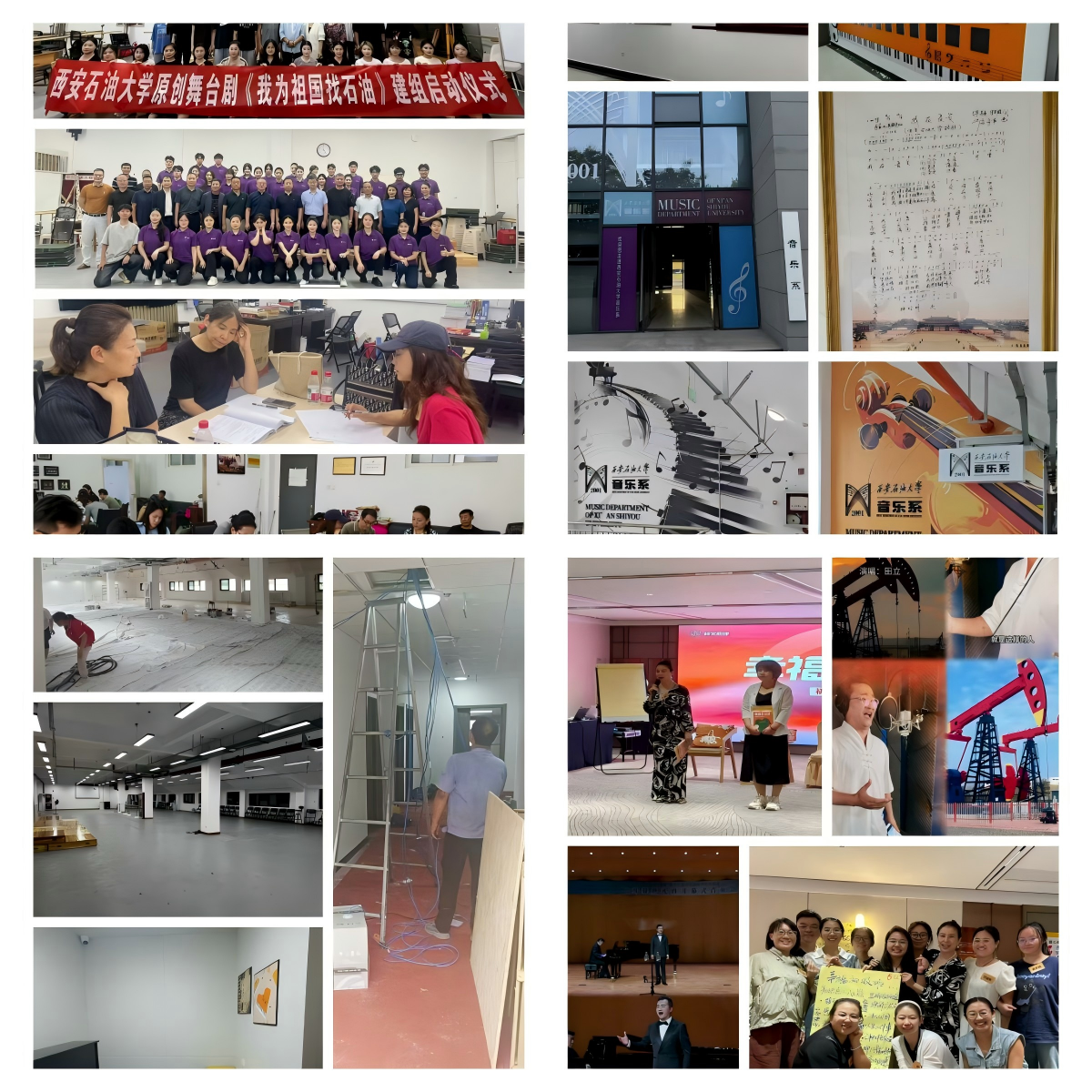一是學(xué)科建設(shè)結(jié)碩果。原創(chuàng)音樂劇《我為祖國找石油——新中國第一支女子測量隊》獲批陜西省藝術(shù)創(chuàng)作重大資助項目,暑期團(tuán)隊封閉打磨劇目,確保高質(zhì)量完成首演。二是教學(xué)服務(wù)再升級。完成鄠邑校區(qū)琴房“一卡通”預(yù)約系統(tǒng)建設(shè)、琴房聲學(xué)構(gòu)建及舞蹈/瑜伽教室維修升級,持續(xù)提升教學(xué)服務(wù)水平。三是環(huán)境育人潤無聲。設(shè)計鄠邑校區(qū)辦公及公共空間文化宣傳展示,通過墻體和展板呈現(xiàn)發(fā)展歷程、辦學(xué)特色等,營造濃郁藝術(shù)氛圍,增強(qiáng)師生歸屬感。四是科研實踐交流齊推進(jìn)。積極推進(jìn)與陜西戲曲研究院深度合作;校合唱團(tuán)成功入選國家大劇院演出季,對接《云橫秦嶺》北京演出事宜;教師榮獲“云崗杯”國際民族器樂展演金獎;精心錄制的《石油人的歌》MV,以藝術(shù)之聲禮贊石油精神;10余人次參加研修班,提升教師隊伍素養(yǎng)。