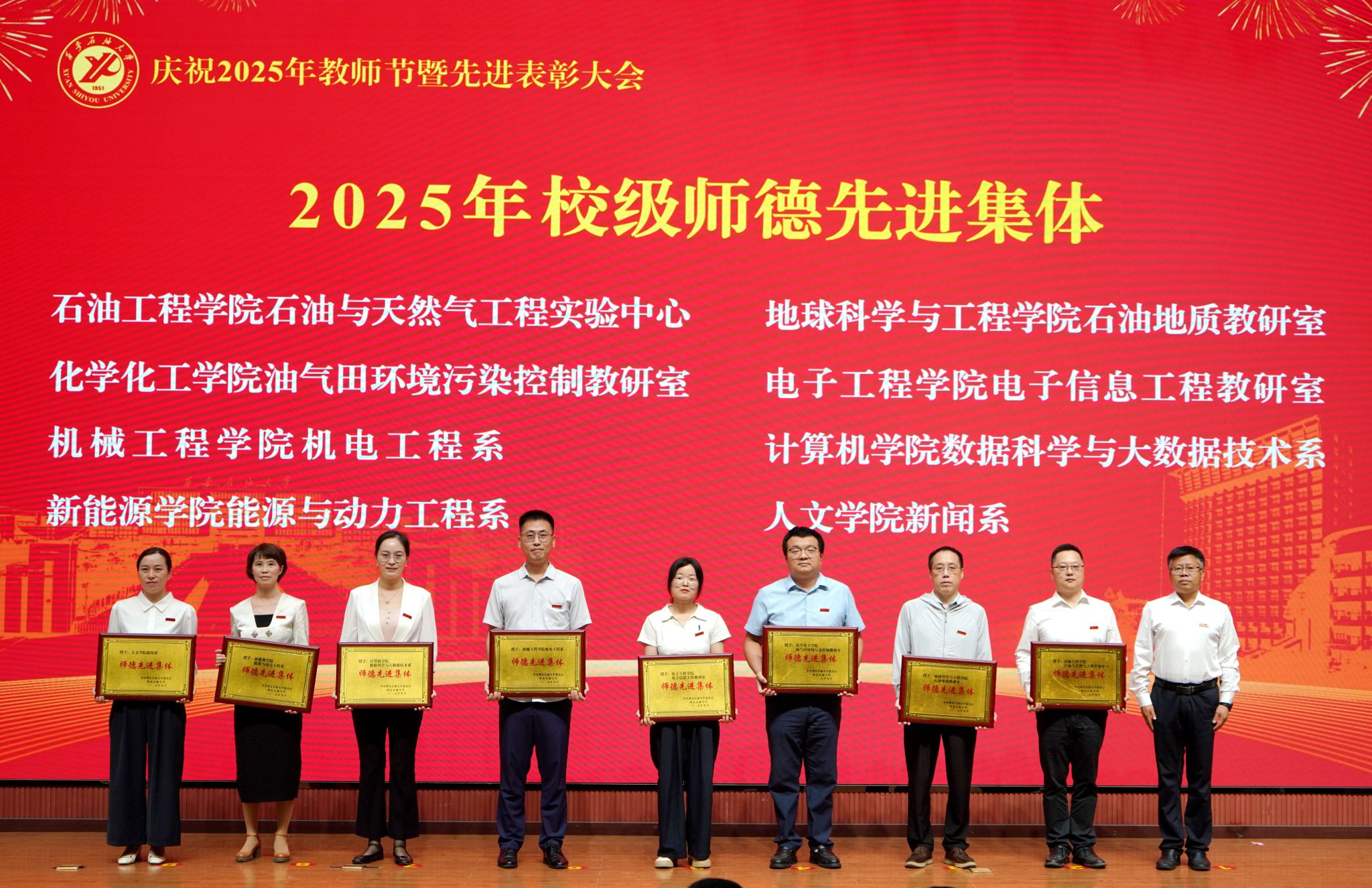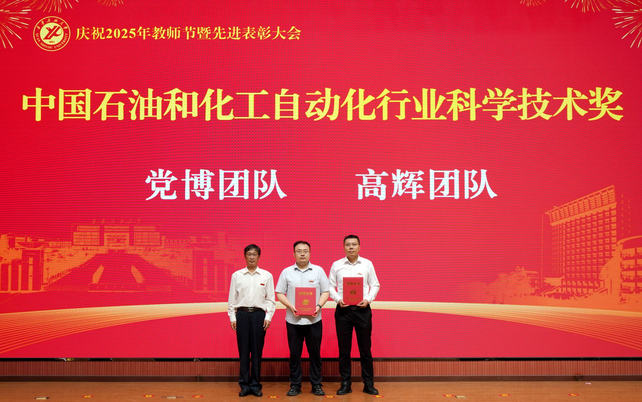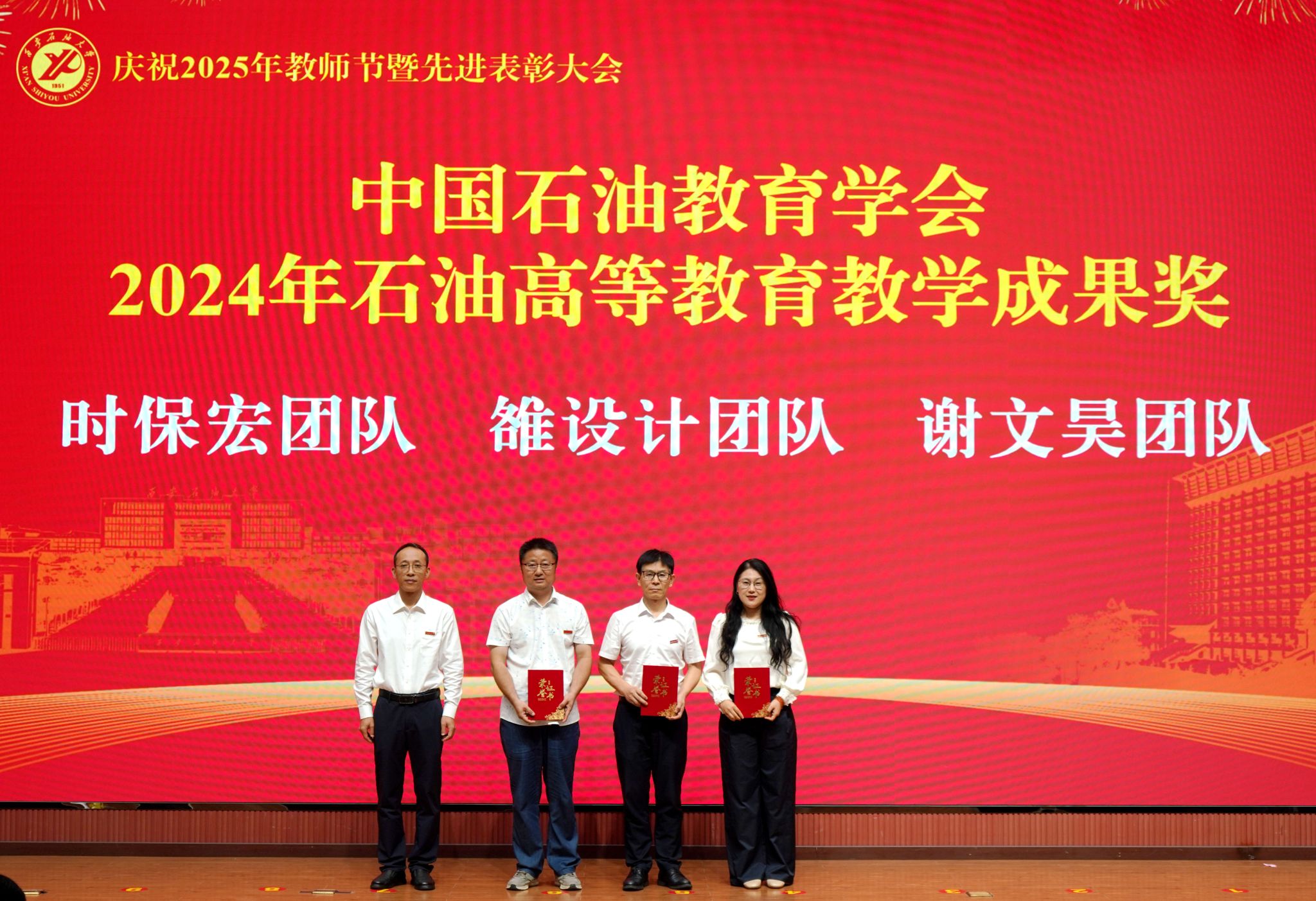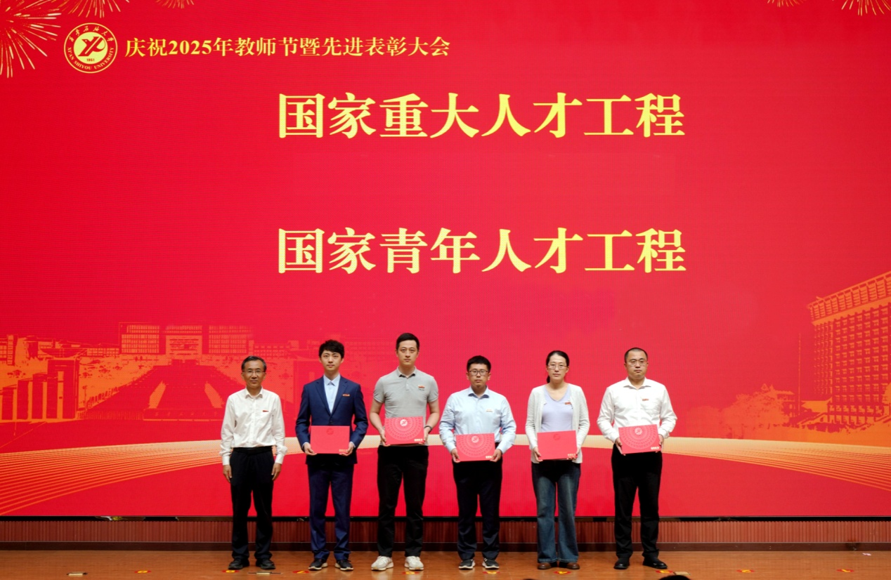 表彰大會在國歌聲中開始,校領導宣讀表彰決定,并為受表彰教師代表頒發(fā)證書和獎章。校黨委副書記張木宣讀2024年度陜西省科學技術進步獎、國家重大人才工程和國家青年人才工程入選名單;校黨委副書記、紀委書記、監(jiān)察專員王輝強宣讀陜西省高層次人才特殊支持計劃等人選名單;副校長蘇文甫宣讀陜西高校優(yōu)秀青年人才支持計劃、陜西省“三秦博創(chuàng)”人才支持項目、中國石油和化工自動化行業(yè)科學技術獎獲獎名單;副校長張榮軍宣讀2025年陜西省科技計劃項目(第三批、第四批)、陜西省2023年高等教育教學成果獎和陜西省第十三屆基礎教育教學成果獎獲獎名單;副校長張君濤宣讀陜西省課程思政精品課程,中國石油教育學會2024年石油高等教育教學成果獎、首屆教師教學創(chuàng)新大賽、首屆課程思政教學大賽獲獎名單;副校長張驍勇宣讀《中共西安石油大學委員會關于表彰2025年師德先進集體和先進個人的決定》;副校長趙健宣讀《西安石油大學關于表彰獎勵“教書育人30年”教師的決定》《中共西安石油大學委員會 西安石油大學關于表彰2025年優(yōu)秀教師、先進教育工作者的決定》;副校長種宇宏宣讀第21屆陜西青年五四獎章和第二屆全國大學生職業(yè)規(guī)劃大賽陜西省決賽獲獎名單,全體與會校領導為受表彰教師代表頒發(fā)證書和獎章。