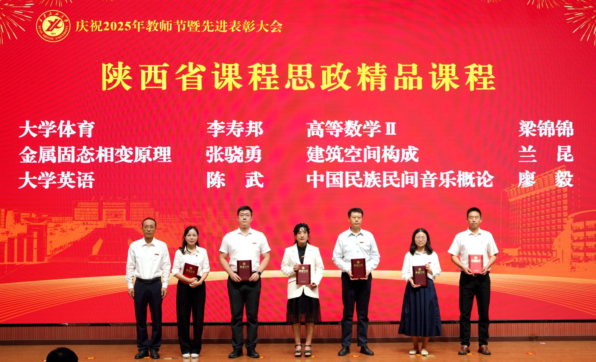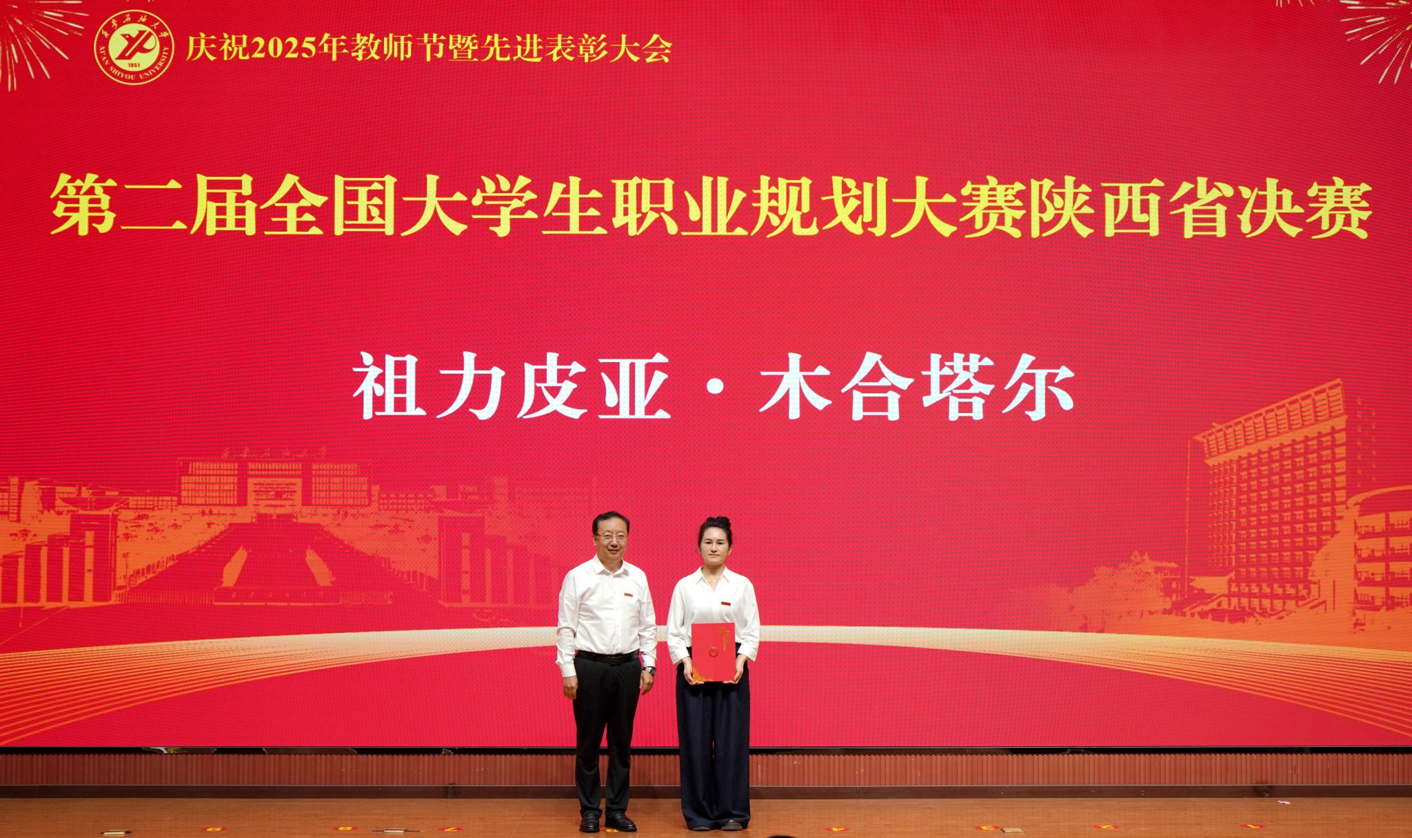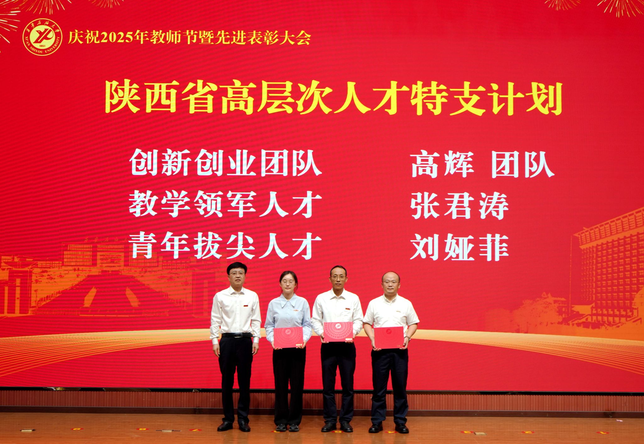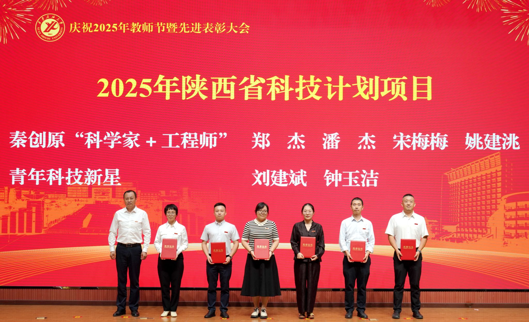 表彰大會在國歌聲中開始,校領導宣讀表彰決定,并為受表彰教師代表頒發(fā)證書和獎章。校黨委副書記張木宣讀2024年度陜西省科學技術進步獎、國家重大人才工程和國家青年人才工程入選名單;校黨委副書記、紀委書記、監(jiān)察專員王輝強宣讀陜西省高層次人才特殊支持計劃等人選名單;副校長蘇文甫宣讀陜西高校優(yōu)秀青年人才支持計劃、陜西省“三秦博創(chuàng)”人才支持項目、中國石油和化工自動化行業(yè)科學技術獎獲獎名單;副校長張榮軍宣讀2025年陜西省科技計劃項目(第三批、第四批)、陜西省2023年高等教育教學成果獎和陜西省第十三屆基礎教育教學成果獎獲獎名單;副校長張君濤宣讀陜西省課程思政精品課程,中國石油教育學會2024年石油高等教育教學成果獎、首屆教師教學創(chuàng)新大賽、首屆課程思政教學大賽獲獎名單;副校長張驍勇宣讀《中共西安石油大學委員會關于表彰2025年師德先進集體和先進個人的決定》;副校長趙健宣讀《西安石油大學關于表彰獎勵“教書育人30年”教師的決定》《中共西安石油大學委員會 西安石油大學關于表彰2025年優(yōu)秀教師、先進教育工作者的決定》;副校長種宇宏宣讀第21屆陜西青年五四獎章和第二屆全國大學生職業(yè)規(guī)劃大賽陜西省決賽獲獎名單,全體與會校領導為受表彰教師代表頒發(fā)證書和獎章。