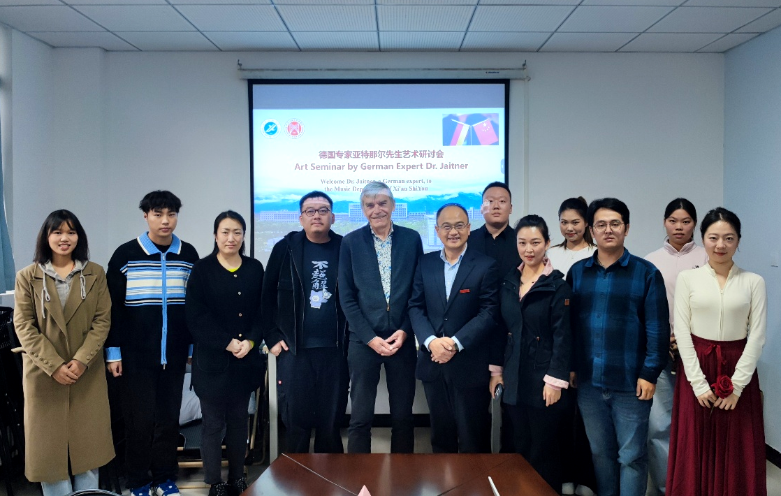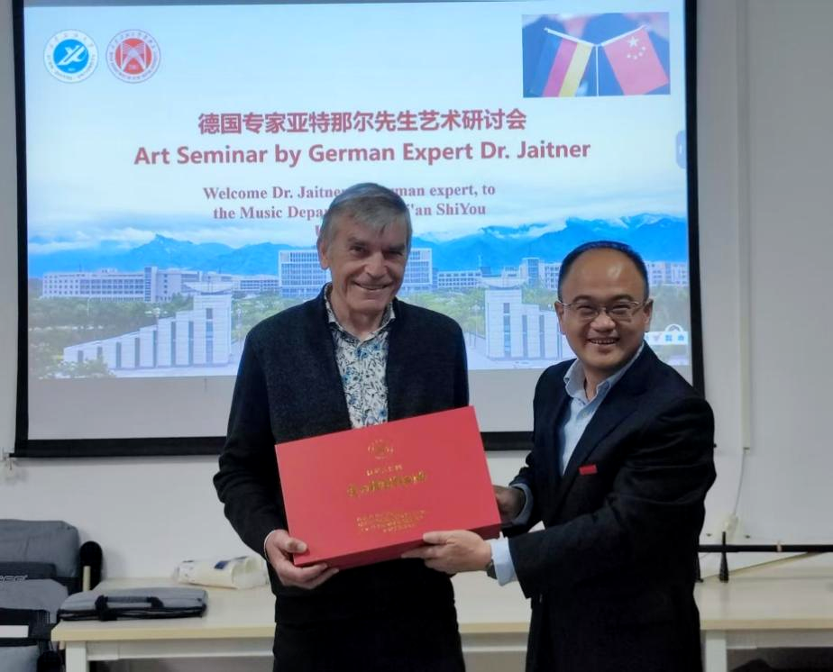 在專業(yè)交流環(huán)節(jié),雙方圍繞藝術創(chuàng)新與國際合作展開深入對話。師生與Jaitner先生就傳統(tǒng)音樂傳承、音樂劇創(chuàng)作、爵士樂發(fā)展等核心議題進行了專業(yè)探討。Jaitner先生結合國際視野提出建設性見解,為師生拓展了創(chuàng)作思路。會議還重點介紹了我校原創(chuàng)音樂劇《我為祖國找石油》,呈現(xiàn)音樂系在紅色題材藝術創(chuàng)作方面的探索成果。針對師生關注的德國留學與學術交流事宜,Jaitner先生詳細介紹了德國相關教育資源與文化環(huán)境,為有意赴德深造的師生提供了實用參考。