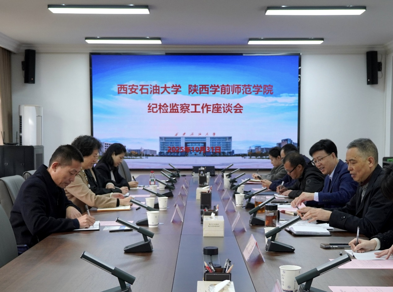 趙瓊對我校的熱情接待表示感謝,并對陜西學(xué)前師范學(xué)院的基本情況和紀(jì)檢監(jiān)察工作有關(guān)情況作了簡要介紹。她表示,西安石油大學(xué)紀(jì)檢監(jiān)察工作成效顯著、富有特色。希望兩校紀(jì)檢監(jiān)察機(jī)構(gòu)進(jìn)一步加強(qiáng)溝通協(xié)作、拓寬視野、創(chuàng)新思路,不斷提升紀(jì)檢監(jiān)察工作質(zhì)效。