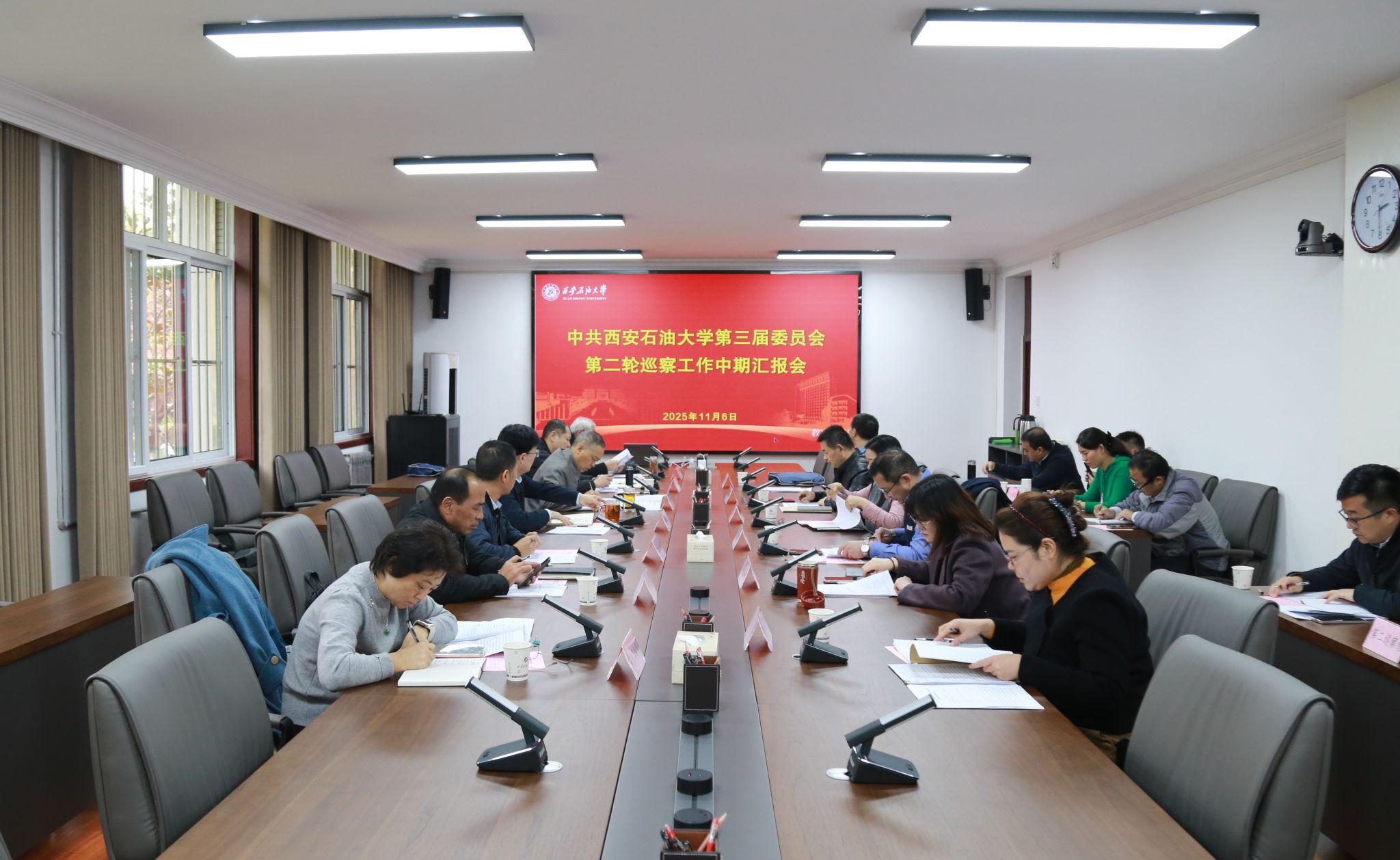 11月6日下午,學(xué)校在鄠邑校區(qū)辦公樓第三會議室召開黨委巡察工作領(lǐng)導(dǎo)小組2025年第五次會議暨第三屆黨委第二輪巡察工作中期匯報會。校黨委副書記、紀委書記、監(jiān)察專員,黨委巡察工作領(lǐng)導(dǎo)小組副組長王輝強出席會議并講話。黨委巡察工作領(lǐng)導(dǎo)小組成員單位主要負責(zé)人和第三屆黨委第二輪巡察第一、第二巡察組全體成員參加會議。會議由黨委巡察辦公室主任茍毅飛主持。
