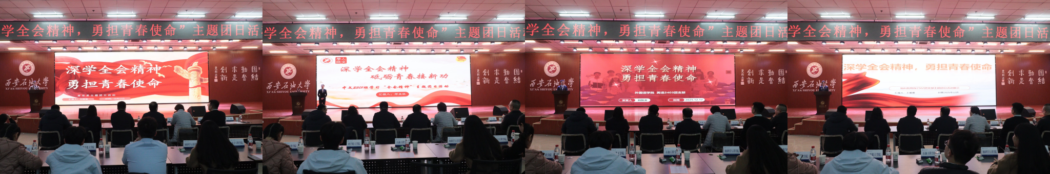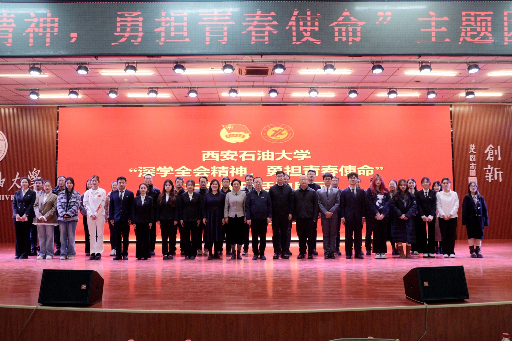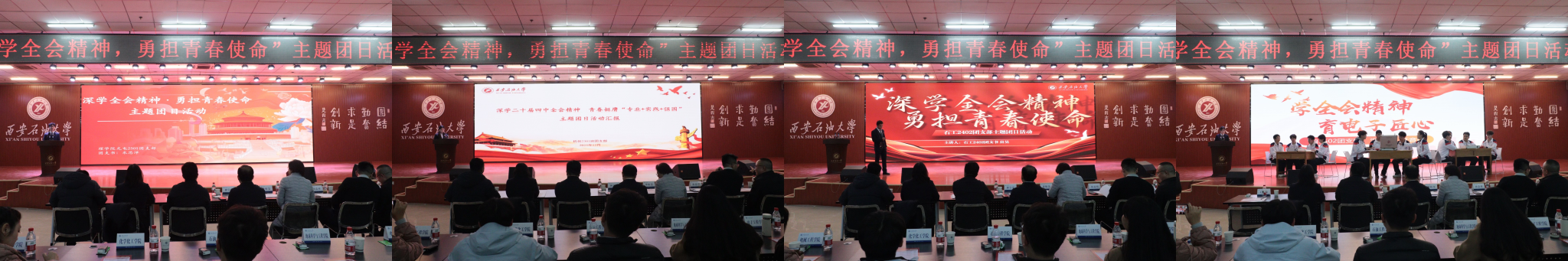 為引導(dǎo)團(tuán)員青年深刻領(lǐng)會(huì)黨的二十屆四中全會(huì)精神核心要義,集中展示我?;鶎訄F(tuán)組織風(fēng)采和主題團(tuán)日活動(dòng)實(shí)效,發(fā)揮先進(jìn)典型的示范引領(lǐng)作用,進(jìn)一步激發(fā)全校團(tuán)員青年的愛國(guó)熱情與奮斗精神,12月17日晚,學(xué)校在鄠邑校區(qū)騰輝大學(xué)生活動(dòng)中心舉辦“深學(xué)全會(huì)精神,勇?lián)啻菏姑敝黝}團(tuán)日活動(dòng)展示,副校長(zhǎng)種宇宏出席,相關(guān)職能處室負(fù)責(zé)人擔(dān)任評(píng)委,各院(系)團(tuán)委(團(tuán)總支)書記及300余名學(xué)生代表參加活動(dòng)。