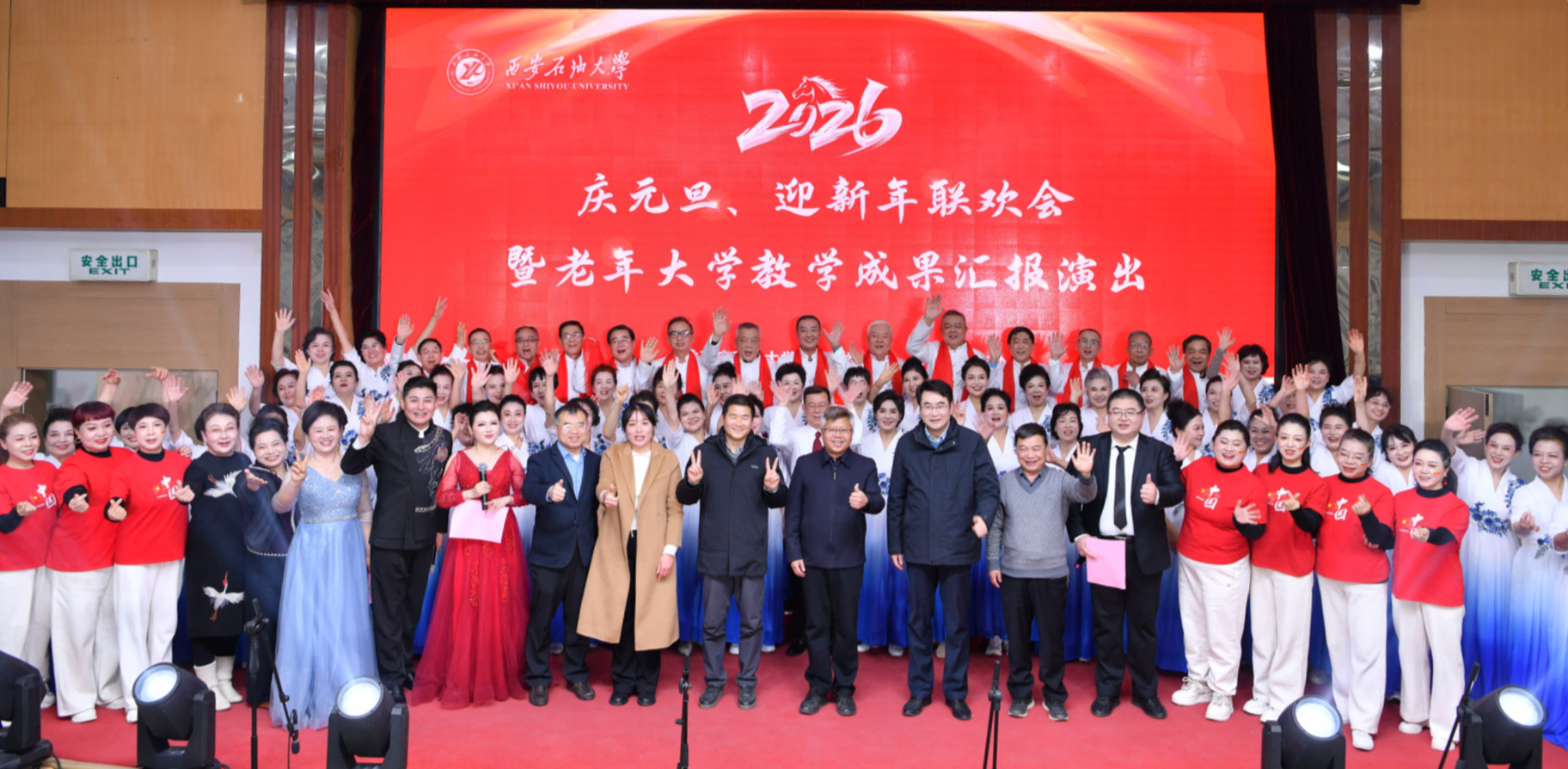 12月29日下午,“慶2026年元旦、迎新年聯(lián)歡會(huì)“暨老年大學(xué)教學(xué)成果匯報(bào)演出在雁塔校區(qū)會(huì)議中心學(xué)術(shù)報(bào)告廳舉行。副校長(zhǎng)張驍勇出席聯(lián)歡會(huì)并致辭,工會(huì)、后勤處、期刊中心、校醫(yī)院、離退休工作處負(fù)責(zé)人與全校300余名離退休職工歡聚一堂,喜迎2026年元旦的到來(lái)。