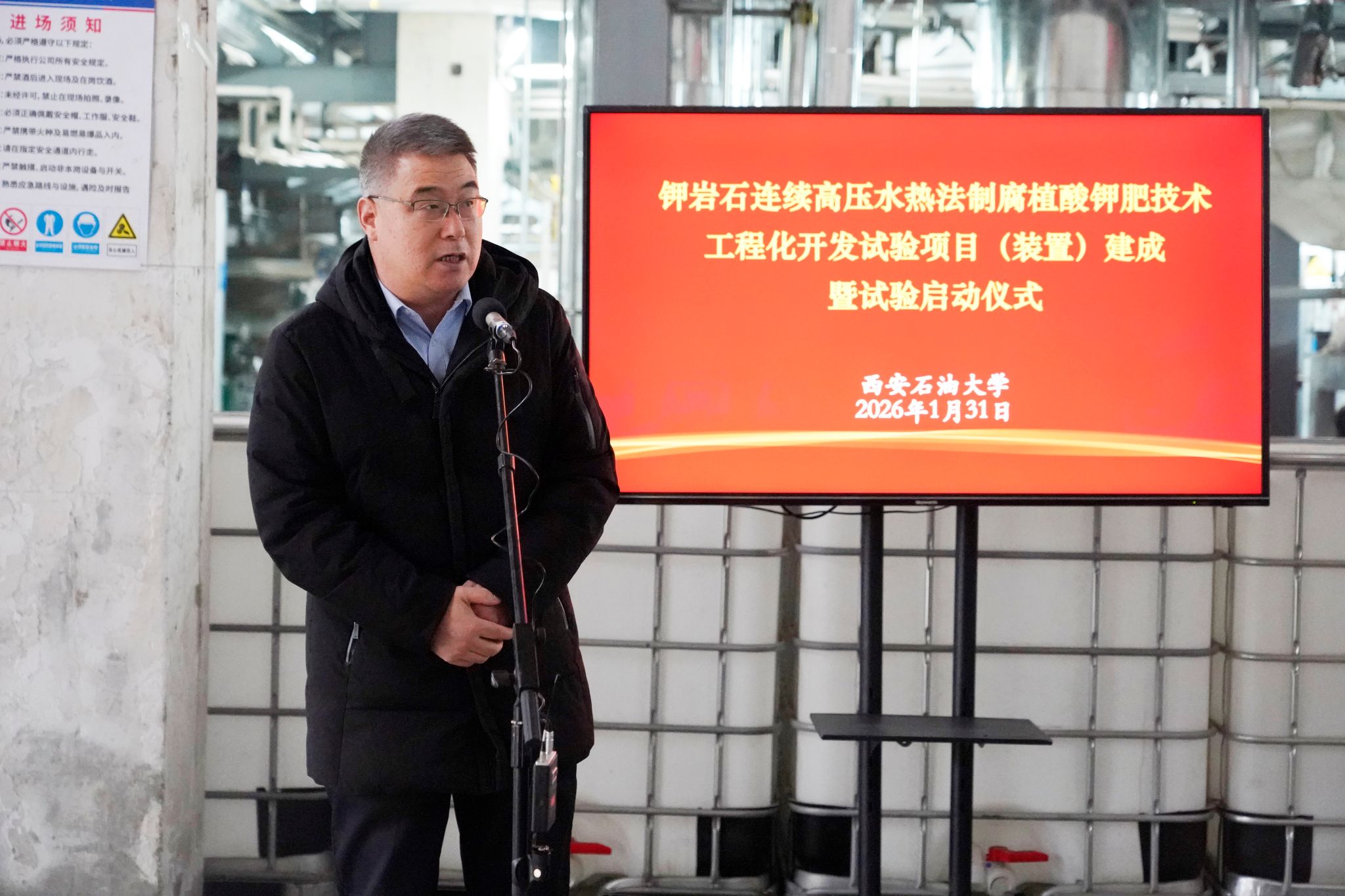 1月31日上午,西安石油大學(xué)“鉀巖石連續(xù)高壓水熱法制腐植酸鉀肥技術(shù)工程化開發(fā)試驗(yàn)項(xiàng)目”建成暨試驗(yàn)啟動儀式在鄠邑校區(qū)如期舉行。校黨委書記常江、校長王進(jìn)富、副校長張榮軍出席儀式,項(xiàng)目聯(lián)合科研團(tuán)隊(duì)負(fù)責(zé)人、承建單位代表以及學(xué)校相關(guān)職能處室負(fù)責(zé)人參加活動,共同見證項(xiàng)目落成投試的重要時(shí)刻。儀式由副校長張君濤主持。