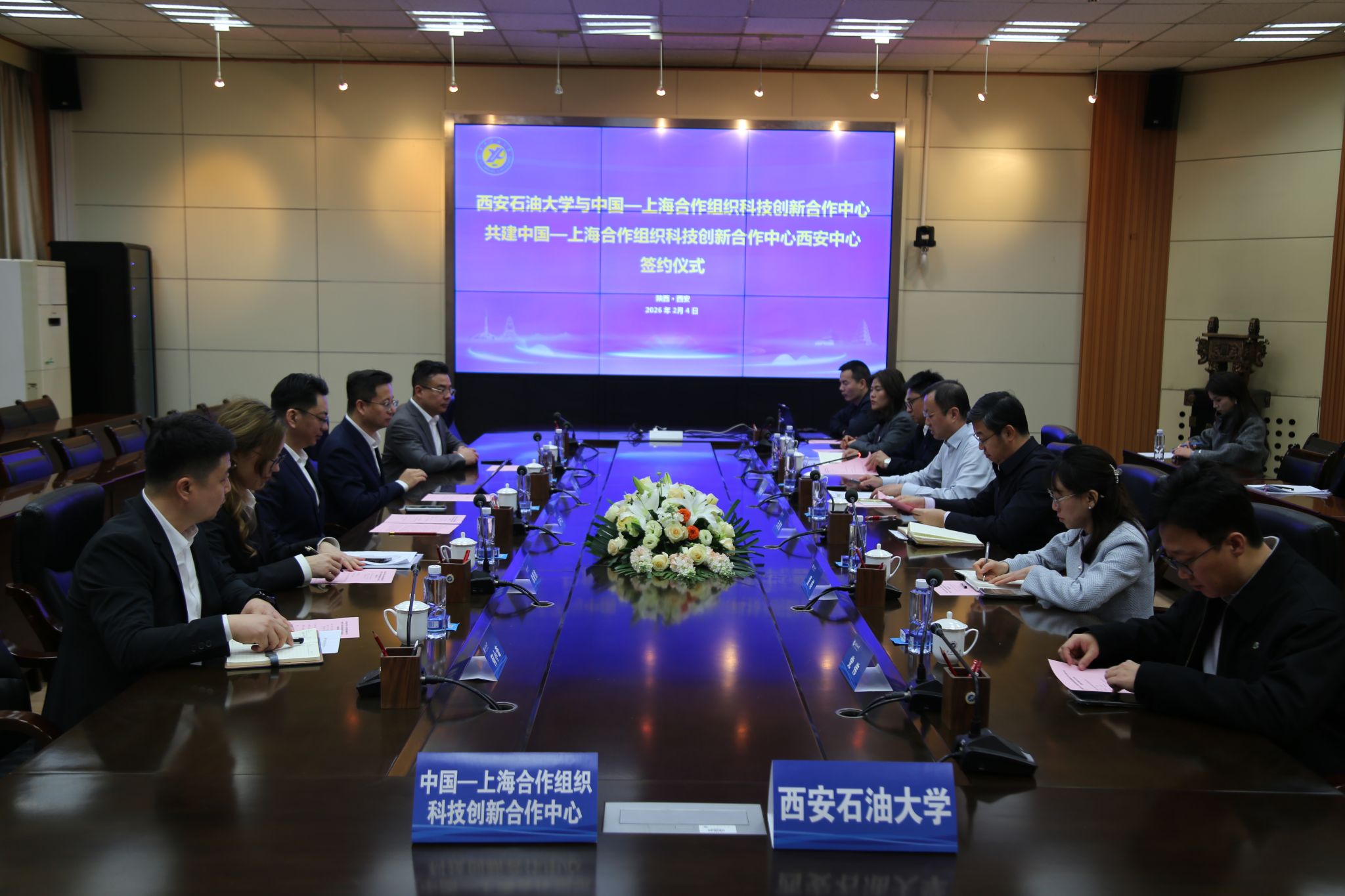 2月4日下午,我校與中國(guó)—上海合作組織科技創(chuàng)新合作中心共建中國(guó)—上海合作組織科技創(chuàng)新合作中心西安中心(以下簡(jiǎn)稱“西安中心”)簽約儀式在雁塔校區(qū)會(huì)議中心第二會(huì)議室舉行。簽約儀式前,校黨委書記常江在貴賓室會(huì)見中國(guó)—上海合作組織科技創(chuàng)新合作中心主任趙中元、副主任單曉旭、副秘書長(zhǎng)羅一鳴、西安中心(籌)籌備組組長(zhǎng)何小奇、西安中心(籌)籌備組副組長(zhǎng)陳文一行。校長(zhǎng)王進(jìn)富、副校長(zhǎng)張榮軍出席會(huì)見及簽約儀式。簽約儀式由張榮軍主持。