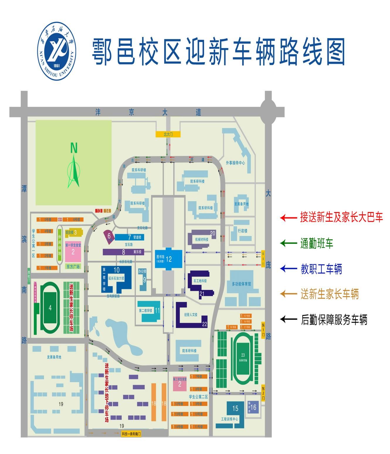鄠邑校區(qū)大環(huán)道實(shí)行單向通行,車輛按照分類從東大門以及北大門進(jìn)入,經(jīng)環(huán)道逆時(shí)針行駛,分別由北大門、東1門(18號(hào)學(xué)生公寓樓南側(cè))、東2門(東區(qū)體育場(chǎng)南側(cè))、科技一條街南門駛出。為確保交通暢通,將車輛分為五類,五類車輛分別為:
