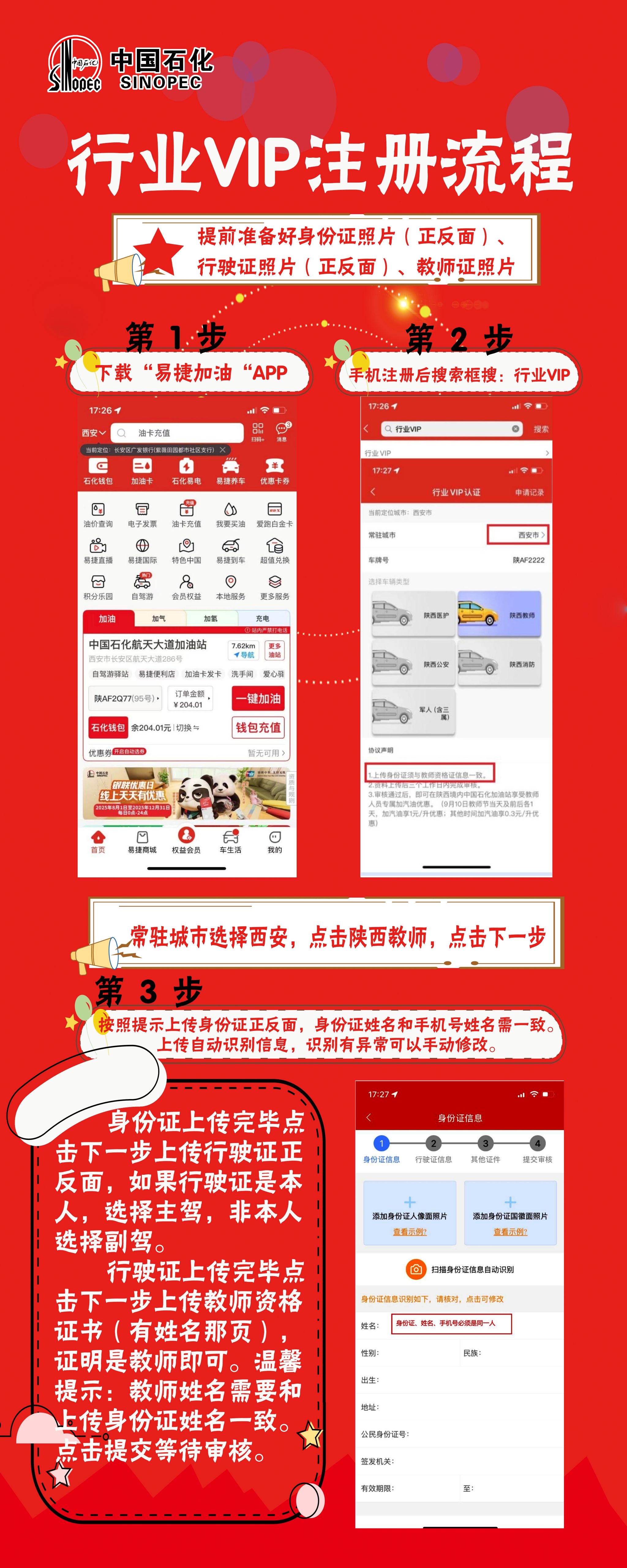 下載“易捷加油“APP→手機完成注冊后搜索框搜:行業(yè)VIP→上傳身份證(正反面)、行駛證(正反面)、教師證或工作證(帶名字及單位章頁),進行專項認證→提交審核→通過后自動加入對應(yīng)標(biāo)簽并享受優(yōu)惠政策。具體操作詳見下圖: