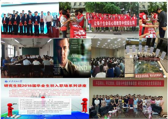 ——促進(jìn)工作,堅持融合。在開展專題學(xué)習(xí)和落實三會一課制度中,研究生院黨委堅持以促進(jìn)工作,學(xué)做融合為原則,要求研究生黨建工作為研究生學(xué)術(shù)實踐和穩(wěn)定安全教育提供思想保證和動力支持。2018年5月至今,在各研究生黨支部積極帶動,研究生黨員模范帶頭下,研究生院超額完成互聯(lián)網(wǎng)+創(chuàng)新創(chuàng)業(yè)大賽報名工作,研究生在石油裝備創(chuàng)新設(shè)計大賽、研究生電子設(shè)計競賽、陜西省研究生創(chuàng)新成果展報名積極,并石油工程設(shè)計大賽等學(xué)科競賽中獲得全國二等獎2項、三等獎3項。在穩(wěn)定安全教育中,充分發(fā)揮黨支部戰(zhàn)斗堡壘作用和研究生黨團(tuán)骨干作用,結(jié)合研究生在學(xué)習(xí)生活中關(guān)注的熱點難點,開展研究生宿舍管理服務(wù)專題座談會;結(jié)合“525心理健康教育月”,開展宣傳倡議、印發(fā)手冊、現(xiàn)場咨詢、科普展覽、電影評析、問卷調(diào)查、主題講座等系列活動;結(jié)合畢業(yè)生文明離校,開展畢業(yè)生初入職場系列講座、畢業(yè)籃球賽、畢業(yè)生黨員座談會、主題征文等,進(jìn)一步強(qiáng)化黨員身份意識,宗旨意識,切實增強(qiáng)黨員榮譽感,責(zé)任感,使命感,為進(jìn)一步加強(qiáng)研究生思想政治教育和積極推進(jìn)研究生黨建工作做出自身更大的貢獻(xiàn)。