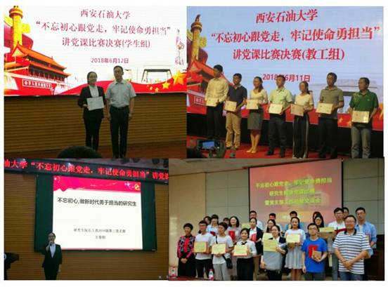 ——開展院級“講黨課”比賽活動。2018年5月,研究生院黨委啟動黨支部書記講黨課比賽活動。經(jīng)前期各黨支部報名推薦、學(xué)院建設(shè)講黨課專題網(wǎng)絡(luò)學(xué)習(xí)頁面、組織開展講黨課微視頻網(wǎng)絡(luò)投票、年級黨支部評議和輔導(dǎo)員推薦、研究生院黨委評審等環(huán)節(jié)概況,于5月24日舉行院級決賽,對20余名講黨課獲獎黨員進(jìn)行了表彰獎勵。經(jīng)選拔,研究生院黨委選送的石工類2016級第三黨支部宣傳委員兼紀(jì)檢委員王春陽、教職工黨支部宣傳委員劉勝勇雙雙進(jìn)入全校決賽,其中王春陽以全校第一名成績榮獲決賽一等獎(學(xué)生組),劉勝勇榮獲全校決賽三等獎(教工組)。