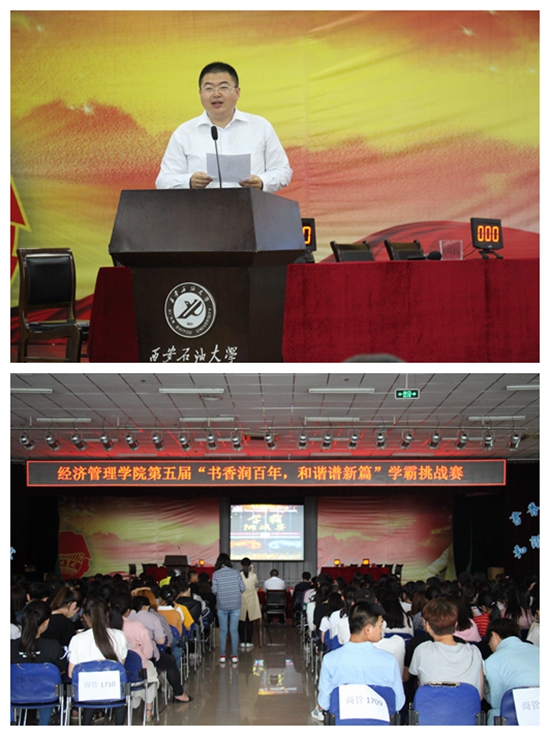5月23日19時,由校團(tuán)委主辦、經(jīng)濟(jì)管理學(xué)院承辦的第五屆“書香潤百年、和諧謀新篇”學(xué)霸挑戰(zhàn)賽在新校區(qū)騰輝大學(xué)生活動中心成功舉辦。經(jīng)濟(jì)管理學(xué)院黨委副書記趙海濤老師、校團(tuán)委馬琦老師、經(jīng)管院部分學(xué)工干部以及600余名學(xué)生共同觀看了此次比賽。