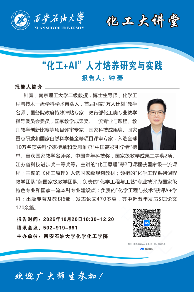 為深入探索人工智能時代化工專業(yè)與課程建設的新路徑與新方法,10月20日上午,化學化工學院“化工大講堂”特邀南京理工大學二級教授、國家級教學名師鐘秦教授,通過騰訊會議線上開展題為“化工+AI人才培養(yǎng)研究與實踐”的專題報告。報告會由化學化工學院黨委書記孫會珠主持,化學化工學院學院師生代表近60人參加了報告會。