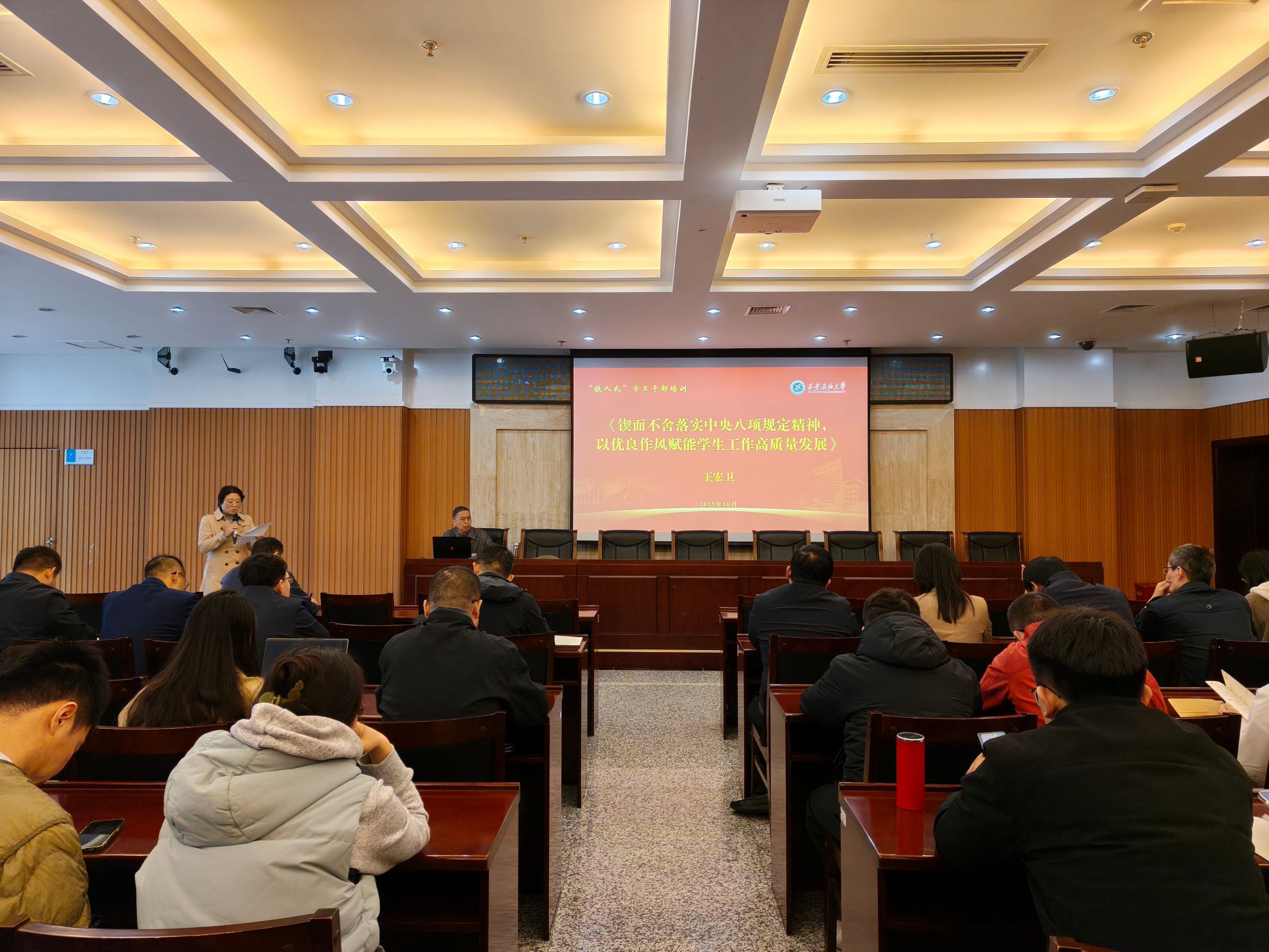 為深入落實中央八項規(guī)定精神,以優(yōu)良作風賦能學生工作高質量發(fā)展,進一步強化學工干部紀律作風建設與立德樹人履職盡責能力,2025年10月21日下午,學生工作部在鄠邑校區(qū)第一會議室舉辦“鐵人式”學工干部專題培訓第六講。校紀委副書記王宏衛(wèi)受邀作題為《鍥而不舍落實中央八項規(guī)定精神,以優(yōu)良作風賦能學生工作高質量發(fā)展》的專題報告,報告由學生工作部副部長畢軼慧主持,全體學工干部參加。