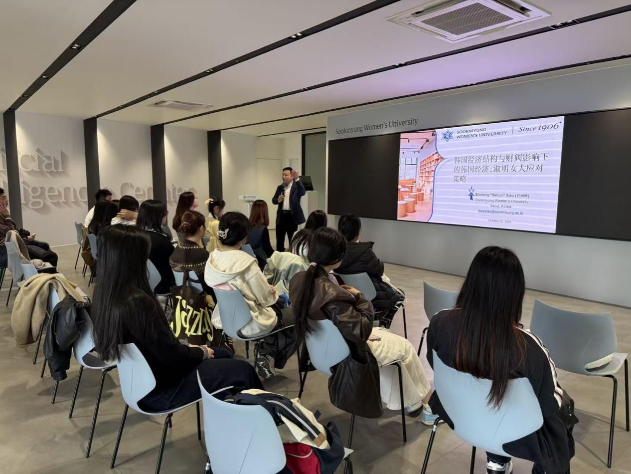 在淑明女子大學(xué)的學(xué)術(shù)交流環(huán)節(jié),研習(xí)團師生深入?yún)⑴c了多場高水平專題講座。肖樹峰教授主講的《韓國經(jīng)濟結(jié)構(gòu)與財閥影響下的韓國經(jīng)濟:淑明女子應(yīng)對策略》,從全球經(jīng)濟格局的宏觀視角切入,詳細(xì)解析了韓國經(jīng)濟的發(fā)展歷程、產(chǎn)業(yè)結(jié)構(gòu)特征及其在全球價值鏈中的定位。講座聚焦三星、現(xiàn)代、SK等財閥集團對韓國經(jīng)濟生態(tài)的深遠(yuǎn)影響,引發(fā)了師生對新興經(jīng)濟體發(fā)展模式的深入思考。