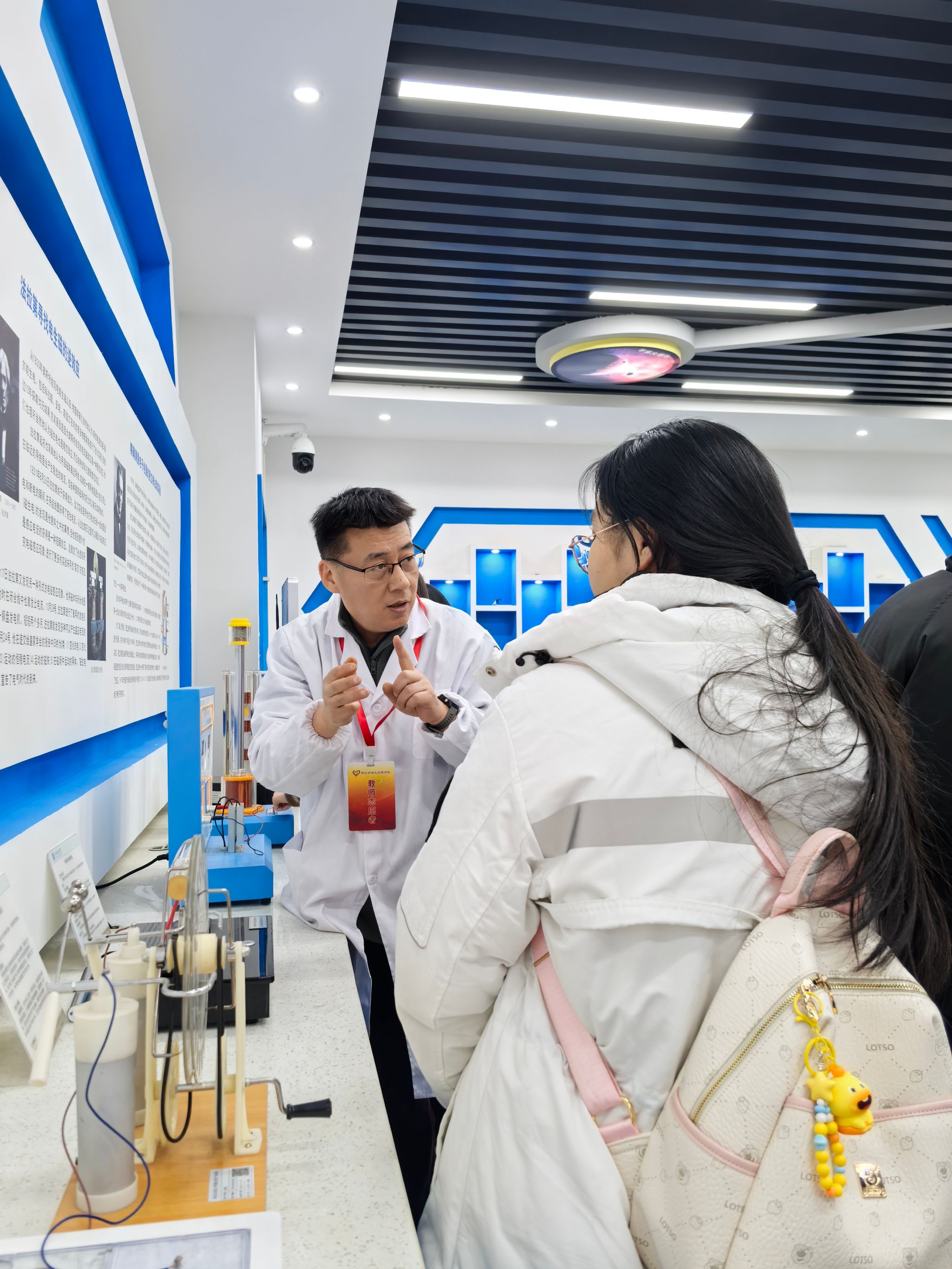 研學活動第二站來到理學院物理演示實驗室。物理演示實驗室是陜西省科普教育基地,是集圖像演示、實物操作等功能為一體的開放性實驗室,涵蓋了力學、電磁學、光學、熱學等方面知識。在理學院師生講解員的耐心講解和示范下,同學們依次參觀并親身體驗了一系列精彩的物理實驗。從靈巧的機械裝置,到神奇的電磁感應;從熱現(xiàn)象的微觀奧秘,到光和影的奇幻世界,每一個實驗都讓同學們驚嘆不已,深深感受到了物理世界的無窮魅力。這些精心設計的演示實驗,不僅激發(fā)了學生對物理學奧秘的好奇心與探索欲,更為大家搭建起了一座通往科學殿堂的橋梁,讓物理之美躍然眼前,深入人心。