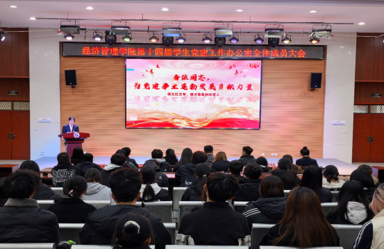 為深入貫徹習(xí)近平新時(shí)代中國(guó)特色社會(huì)主義思想,提升學(xué)生黨建工作人員履職能力,接續(xù)發(fā)揮先鋒模范作用,11月19日,經(jīng)濟(jì)管理學(xué)院在鄠邑校區(qū)崇文樓118多功能廳舉行第十四屆學(xué)生黨建工作辦公室全體成員大會(huì)。經(jīng)濟(jì)管理學(xué)院黨委副書記趙紀(jì)飛、學(xué)生工作辦公室副主任張碩、組織員曹萌,學(xué)生黨建工作辦公室指導(dǎo)老師王業(yè)林、學(xué)生黨建工作辦公室全體成員共180余人參會(huì)。