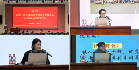 11月10日晚,培訓(xùn)第二講由校院兩級(jí)優(yōu)秀學(xué)生干部代表在弘石學(xué)術(shù)報(bào)告廳作工作經(jīng)驗(yàn)分享。研究生會(huì)執(zhí)行主席張振陸以“同研會(huì)逐光,赴成長(zhǎng)遠(yuǎn)方”為題,從研會(huì)總體概況、部門特色活動(dòng)、個(gè)人成長(zhǎng)三個(gè)方面向同學(xué)們分享工作技能;校學(xué)生會(huì)主席團(tuán)成員虞茗荃以“學(xué)生干部核心素養(yǎng)和文體活動(dòng)籌備”為題,展開(kāi)活動(dòng)籌備的技能傳授,助力學(xué)生會(huì)新成員掌握協(xié)調(diào)溝通、活動(dòng)策劃等核心技能;石油工程學(xué)院學(xué)生會(huì)執(zhí)行主席梁國(guó)璽以“工作開(kāi)展與籌辦”為題,從活動(dòng)類型分析、活動(dòng)流程總結(jié)、活動(dòng)宣傳推廣三個(gè)方面分享經(jīng)驗(yàn),助力學(xué)生會(huì)成員提升工作能力。