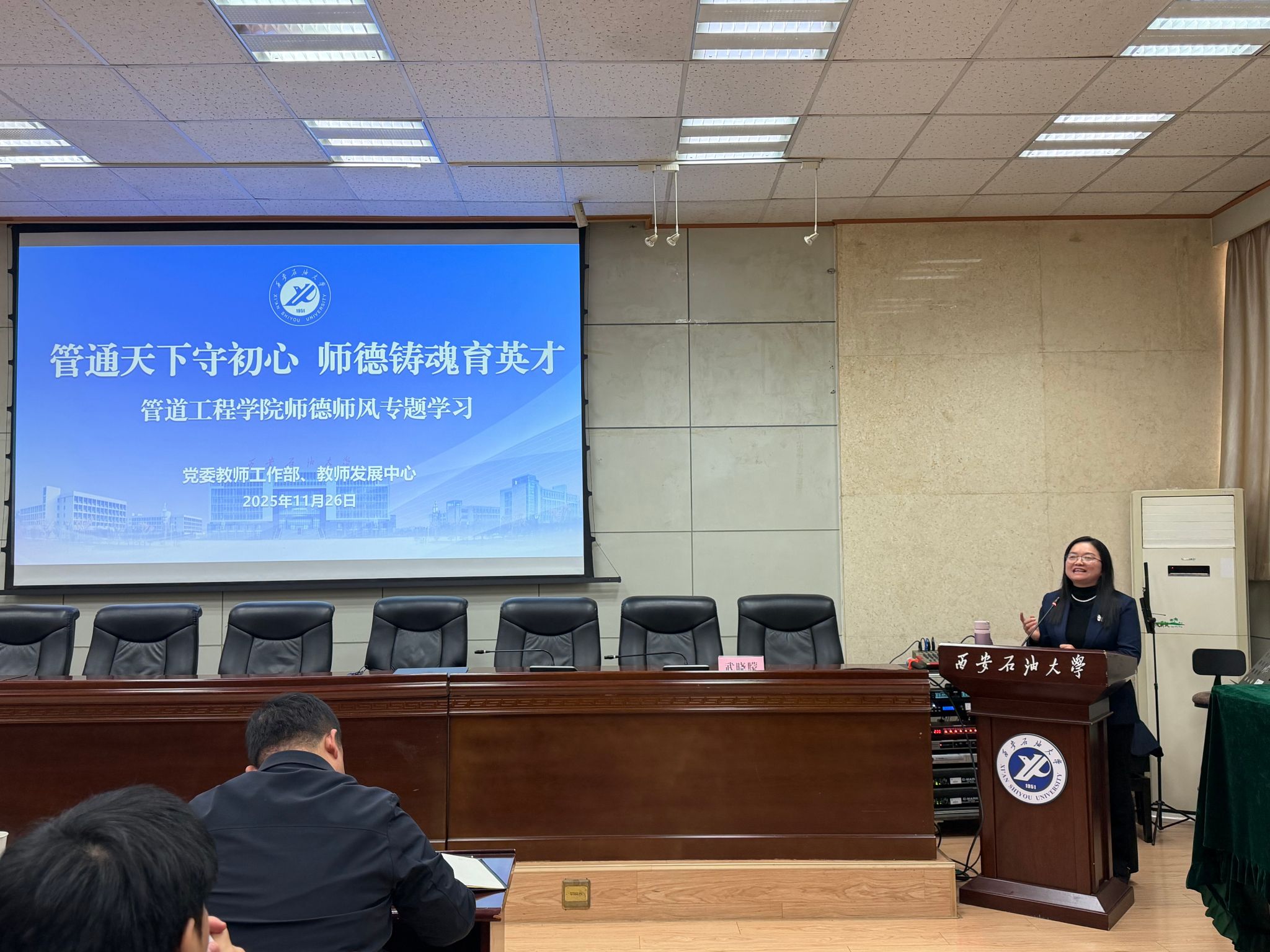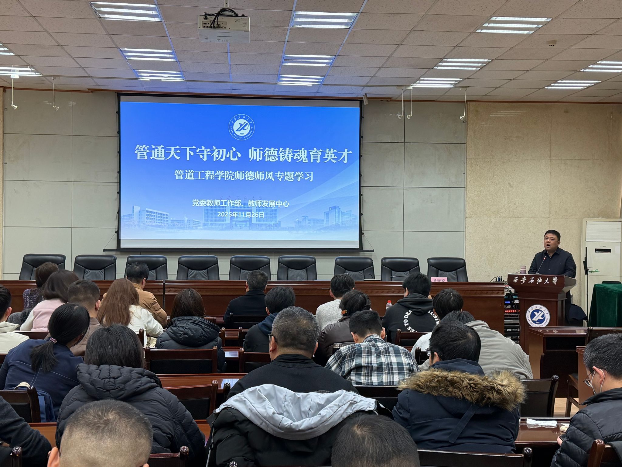 11月26日下午,由管道工程學院黨委主辦的“學黨章鑄忠誠,悟思想強使命”專題學習班第一講在雁塔校區(qū)西階第三會議室舉行。校黨委教師工作部部長、教師發(fā)展中心主任武曉朦教授擔任主講,主講題目為“管通天下守初心 師德鑄魂育英才”,學院全體教職工及研究生代表參加學習。會議由學院黨委副書記高亮主持。