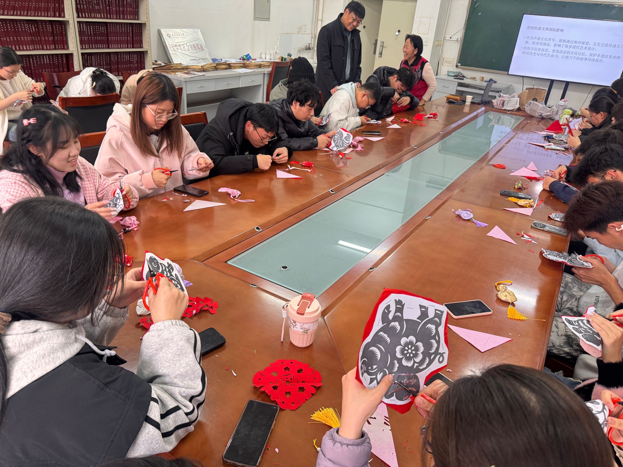活動現場,78歲的肖志賢老人以輕松幽默的語言和深入淺出的講解,為同學們系統(tǒng)梳理了剪紙藝術的起源、內容與地域特色。從吉祥文字到神話傳說,從十二生肖到花鳥蟲魚,她不僅生動解讀了剪紙背后的民俗信仰與生命禮俗,更以“諧音象征”為例,巧妙串聯起中國人的生活哲學與樂觀智慧。講解過程中,金句頻出、妙趣橫生,引得現場笑聲不斷,掌聲迭起。