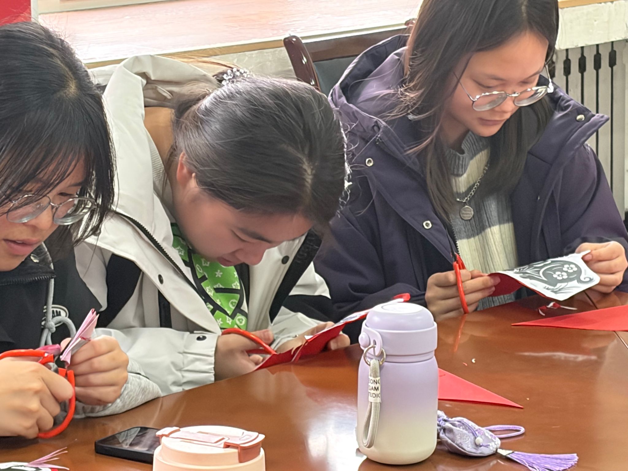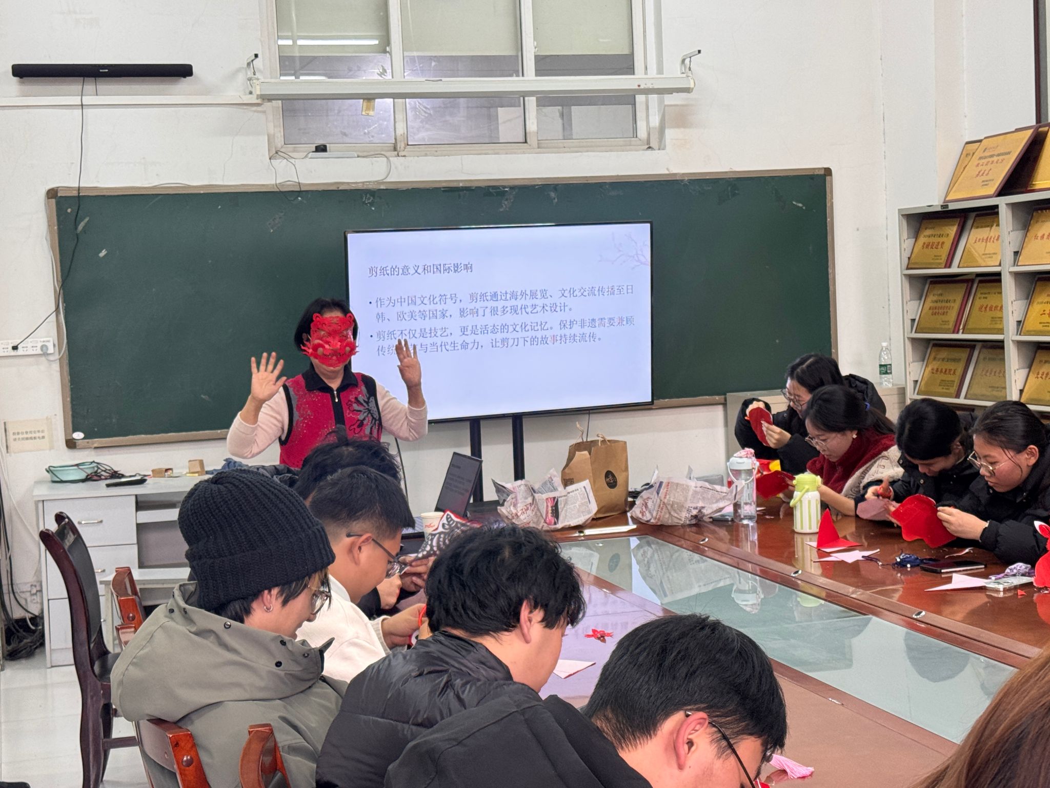 在實踐展示環(huán)節(jié),肖志賢老人展示出令人驚嘆的剪紙技藝。只見她手中剪刀行云流水、紙屑紛飛,不過片刻,一幅幅精美靈動的圖案便躍然眼前,引來同學們陣陣歡呼。在肖老師的帶動下,大家紛紛動手嘗試,全神貫注于折紙、勾畫、裁剪之間。伴隨著剪刀起落,一朵朵紅花、一只只靈獸逐漸在指尖綻放,現場氣氛熱烈而溫馨,充滿成就感和歡聲笑語。