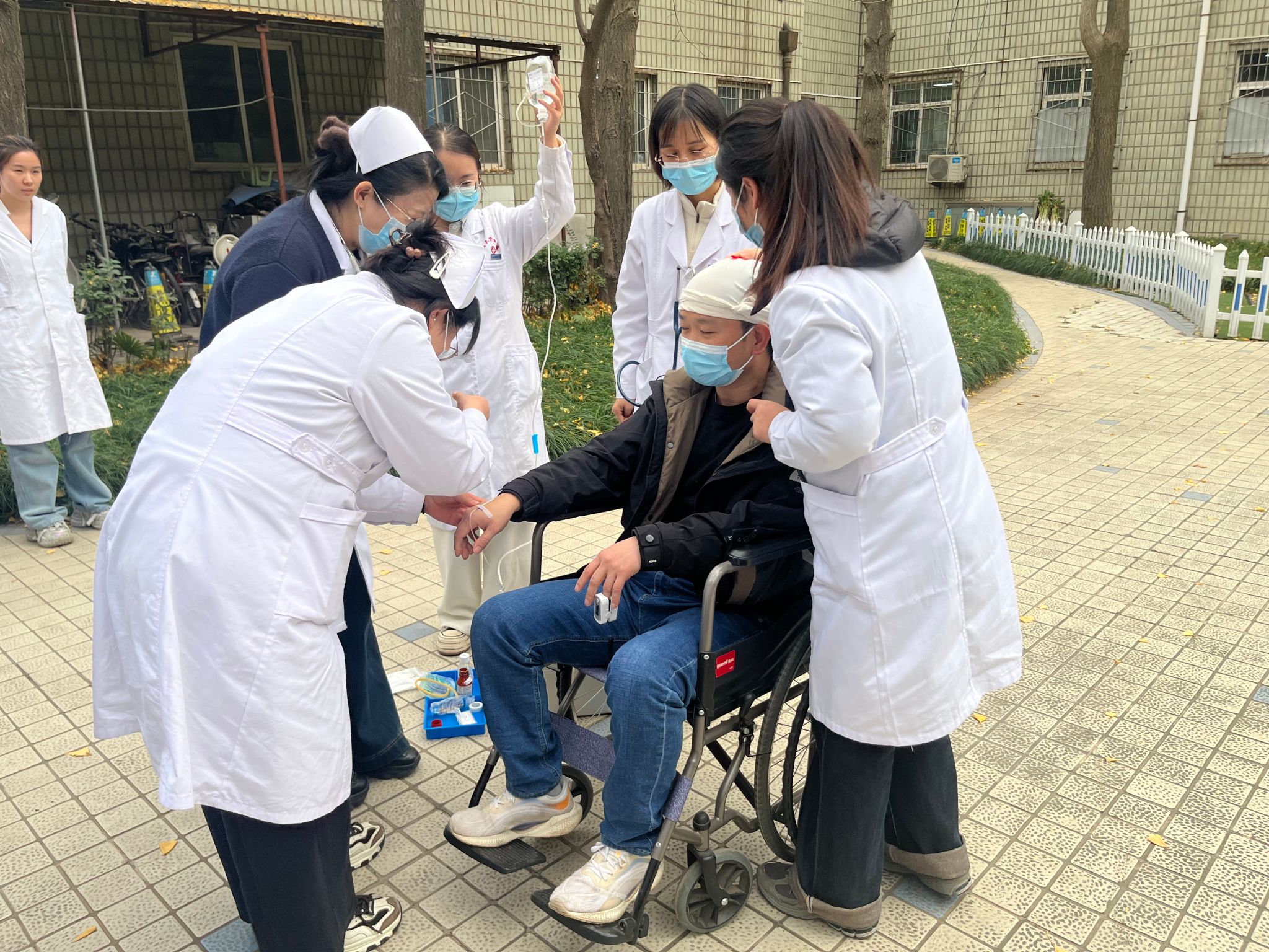 與此同時(shí),疏散引導(dǎo)人員快速打開安全出口,引導(dǎo)就診患者及醫(yī)護(hù)人員用濕毛巾捂住口鼻,彎腰低姿沿預(yù)定疏散路線快速撤離。針對(duì)行動(dòng)不便的模擬患者,工作人員采用攙扶、輪椅轉(zhuǎn)運(yùn)等方式全程協(xié)助,做到不推擠、不遺漏,確保所有人員在規(guī)定時(shí)間內(nèi)安全撤離至室外指定集合點(diǎn),各小組隨即快速清點(diǎn)人數(shù)并向指揮部匯報(bào)。醫(yī)院應(yīng)急醫(yī)療小組同步在疏散現(xiàn)場(chǎng)搭建臨時(shí)救護(hù)點(diǎn),丁麗團(tuán)隊(duì)全力協(xié)助醫(yī)療演練開展,配合做好救護(hù)物資轉(zhuǎn)運(yùn)、模擬患者傷情配合、救治現(xiàn)場(chǎng)輔助等工作,助力醫(yī)療小組高效完成傷口處理、吸氧、頭部包扎等緊急救治流程,充分彰顯醫(yī)療應(yīng)急處置的專業(yè)性與團(tuán)隊(duì)協(xié)作的高效性。