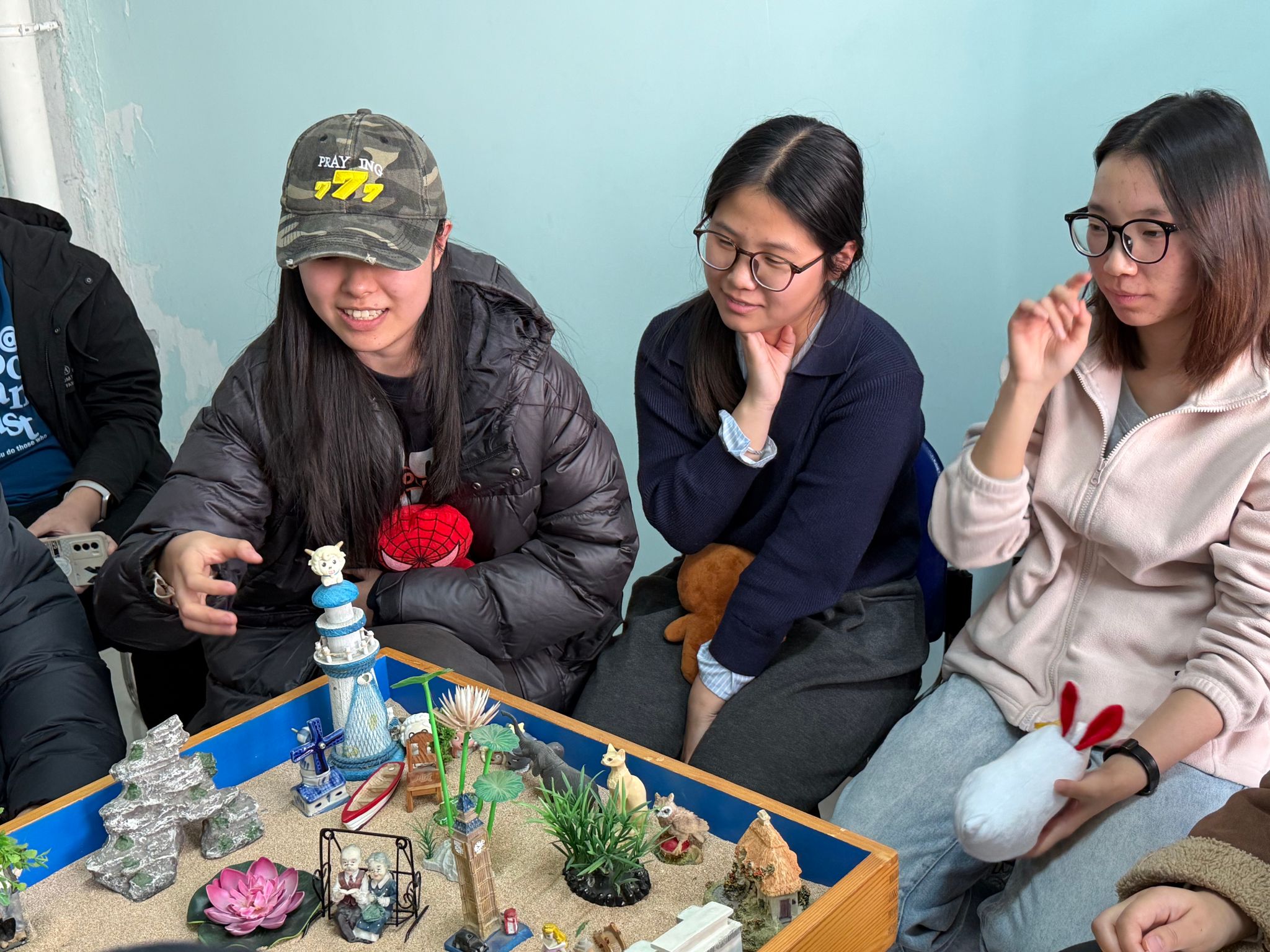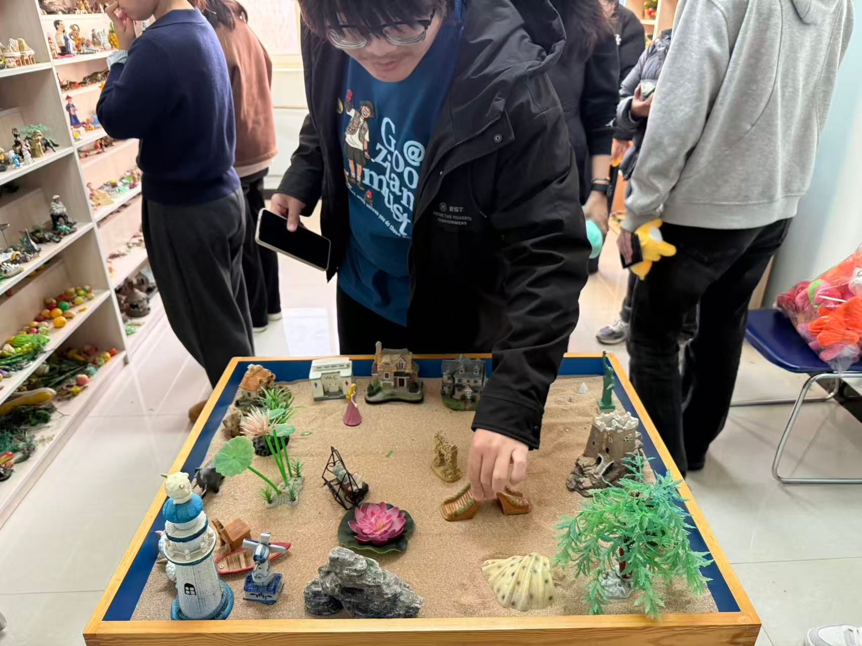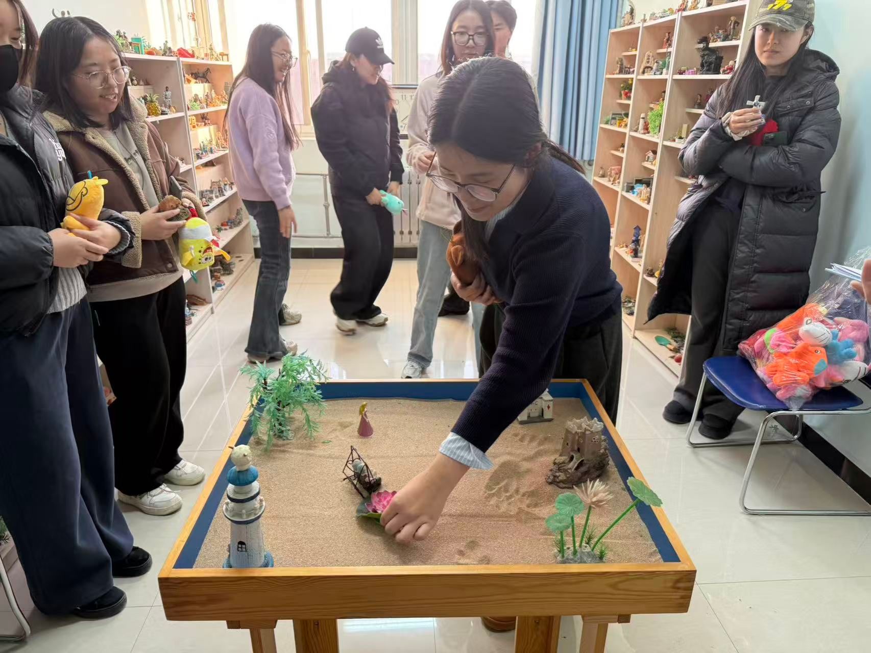 在沙盤心理測試與分享交流環(huán)節(jié),學(xué)生在閆老師的分組引導(dǎo)下走進(jìn)心理沙盤室。大家面對陳列架上涵蓋人物、建筑、自然、交通等多個類別的數(shù)百件沙具,暫時(shí)放下復(fù)習(xí)的疲憊,遵循內(nèi)心直覺挑選沙具,在特制沙盤內(nèi)通過堆沙、擺放道具等方式,構(gòu)建出專屬的“心理圖景”。過程中,心理老師全程跟進(jìn)觀察,細(xì)致記錄學(xué)子的沙具選擇順序、擺放位置及情緒變化,為后續(xù)的解讀交流積累基礎(chǔ)。