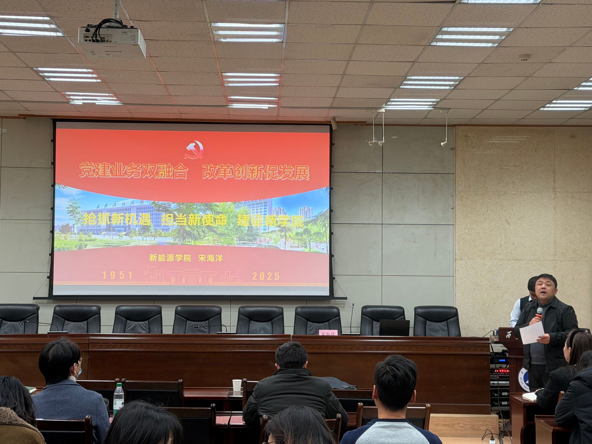 宋海洋從黨建引領(lǐng)與業(yè)務(wù)發(fā)展兩個(gè)維度展開(kāi)闡述,他指出,學(xué)院要立足新發(fā)展階段、踐行新發(fā)展理念、構(gòu)建新發(fā)展格局、推動(dòng)高質(zhì)量發(fā)展,就要明確短期發(fā)展靠管理、中期發(fā)展靠制度、長(zhǎng)期發(fā)展靠文化的理念,具體要從四個(gè)方面下功夫:一是要嚴(yán)守政治紀(jì)律規(guī)矩,汲取智慧增強(qiáng)后勁。結(jié)合學(xué)校和學(xué)院實(shí)際,堅(jiān)持學(xué)思用貫通、知信行統(tǒng)一,著眼以學(xué)鑄魂、以學(xué)增智、以學(xué)正風(fēng)、以學(xué)促干,切實(shí)將理論學(xué)習(xí)、調(diào)查研究、推動(dòng)發(fā)展、檢視整改、建章立制等五項(xiàng)重點(diǎn)措施貫穿始終,以高標(biāo)準(zhǔn)、嚴(yán)要求、實(shí)措施推動(dòng)主題教育走深走實(shí);二是要抓實(shí)基層黨建工作,強(qiáng)基固本示范引領(lǐng)。嚴(yán)格執(zhí)行“三會(huì)一課”等組織生活制度,將組織生活和教研活動(dòng)緊密結(jié)合,積極推動(dòng)黨員發(fā)展工作,日常中要加強(qiáng)對(duì)黨支部書(shū)記的培訓(xùn);三是要強(qiáng)化黨建政治引領(lǐng),創(chuàng)新模式推動(dòng)發(fā)展。創(chuàng)新黨委和黨支部工作模式,加強(qiáng)黨支部規(guī)范化建設(shè),充分發(fā)揮黨員和黨支部的模范帶頭作用與戰(zhàn)斗堡壘作用;四是要搶抓關(guān)鍵時(shí)間節(jié)點(diǎn),培根鑄魂啟智潤(rùn)心。宋海洋通過(guò)分享新能源學(xué)院以新能源與油氣融合為特色,明確學(xué)科方向,加強(qiáng)學(xué)科建設(shè),實(shí)施青年教師教研能力提升“強(qiáng)師工程”,搭建交流平臺(tái),著力培養(yǎng)適應(yīng)新時(shí)代需求的專業(yè)人才的經(jīng)驗(yàn),取得的顯著成效,強(qiáng)調(diào)了思想政治工作貫穿教育全過(guò)程的同時(shí),要注重關(guān)鍵節(jié)點(diǎn)的教育引導(dǎo)。