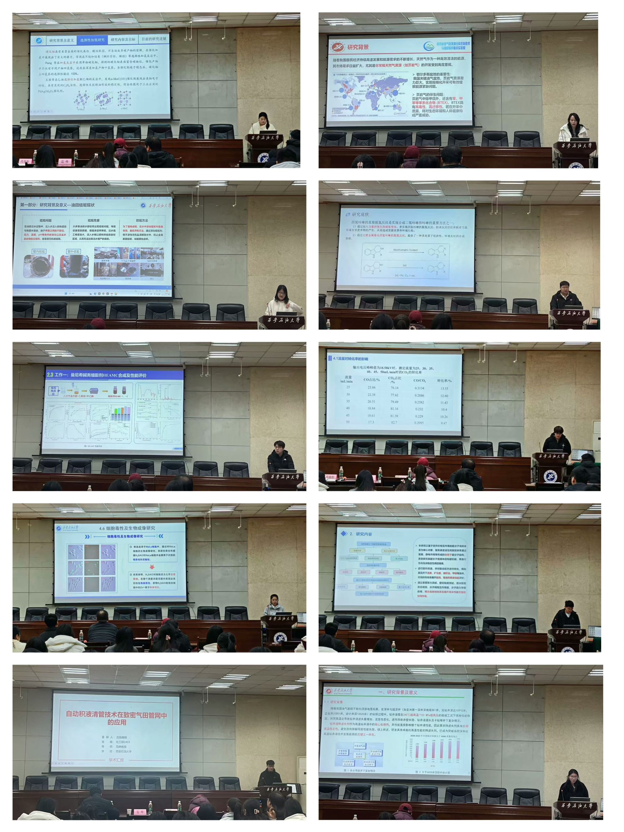 面向國家能源安全重大需求,多位研究生的研究聚焦油氣資源綠色高效開發(fā)領(lǐng)域。沈段高翔同學(xué)介紹的“自動積液清管技術(shù)在致密氣田管網(wǎng)中的應(yīng)用”,展現(xiàn)了化學(xué)工程與多學(xué)科交叉融合解決實(shí)際工程難題的能力。肖佳軒老師特別關(guān)注研究的數(shù)據(jù)支撐,詢問“核心數(shù)據(jù)集的來源”,強(qiáng)調(diào)工程應(yīng)用研究必須以可靠數(shù)據(jù)為基石。