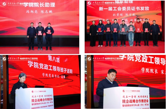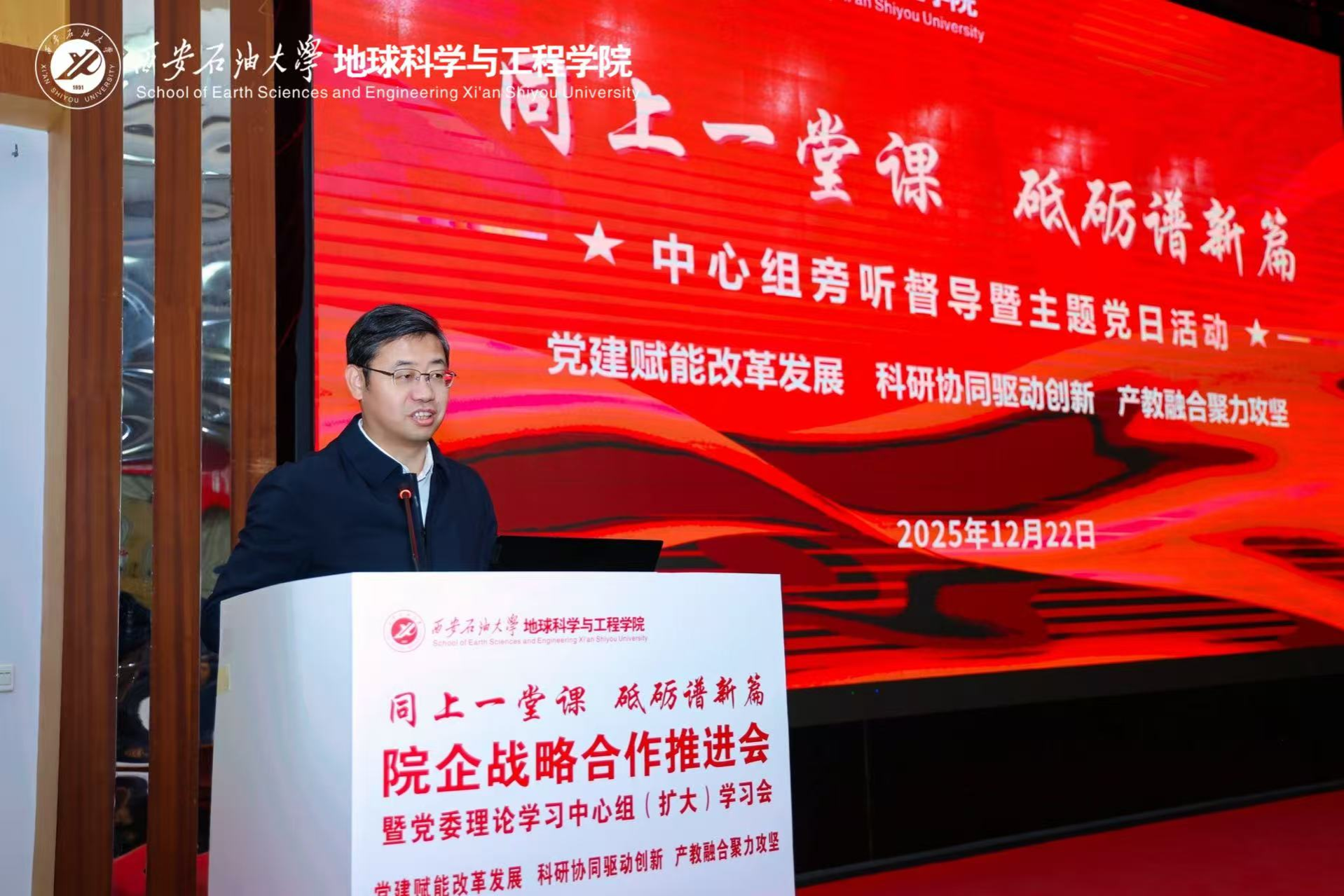 為貫徹落實學(xué)?!叭齻€年”建設(shè)部署,深化“院所制”改革,12月22日,地球科學(xué)與工程學(xué)院“同上一堂課 砥礪譜新篇”院企戰(zhàn)略合作推進會暨黨委理論學(xué)習(xí)中心組(擴大)學(xué)習(xí)會在雁塔校區(qū)舉行。會議以“黨建賦能改革發(fā)展,科研協(xié)同驅(qū)動創(chuàng)新,產(chǎn)教融合聚力攻堅”為主線,通過聯(lián)合研究院揭牌、前沿學(xué)術(shù)報告、專題思政課與學(xué)院內(nèi)部建設(shè)系列議程,匯聚發(fā)展共識,擘畫未來藍(lán)圖。校長王進富,長慶油田首席技術(shù)專家喻健,西安石文軟件有限公司董事長、總經(jīng)理張小會,副總經(jīng)理楊靜波,校友工作與合作交流處相關(guān)負(fù)責(zé)人等校企嘉賓及全院師生代表共同參會。學(xué)院黨委書記高黎主持會議。