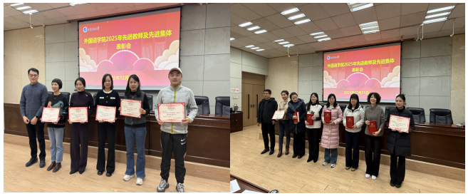 在述職述廉會議之后,學院召開2025年先進教師和先進集體的表彰大會,陳武宣讀了《外國語學院關于公布2025年度先進教師及先進集體評選結果的通知》,對在教育教學、科學研究、人才培養(yǎng)、管理服務等工作中表現突出的4個先進集體和29名先進教師予以隆重表彰。學院黨政領導和工會主席為獲獎集體與個人頒發(fā)榮譽證書,陳武向受表彰的先進集體和先進教師表示熱烈祝賀,他們身上愛崗敬業(yè)、甘于奉獻的精神,值得全體教師學習借鑒,全體教師要以先進為標桿、以榜樣為力量、主動對標看齊,為學院發(fā)展貢獻自己的力量。
