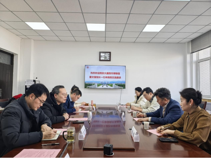 1月6日下午,西安大唐西市博物館館長董文強一行5人蒞臨我院,開展座談交流。交流會在鄠邑校區(qū)崇文樓314會議室舉行,外國語學(xué)院黨政領(lǐng)導(dǎo)及師生代表參會。