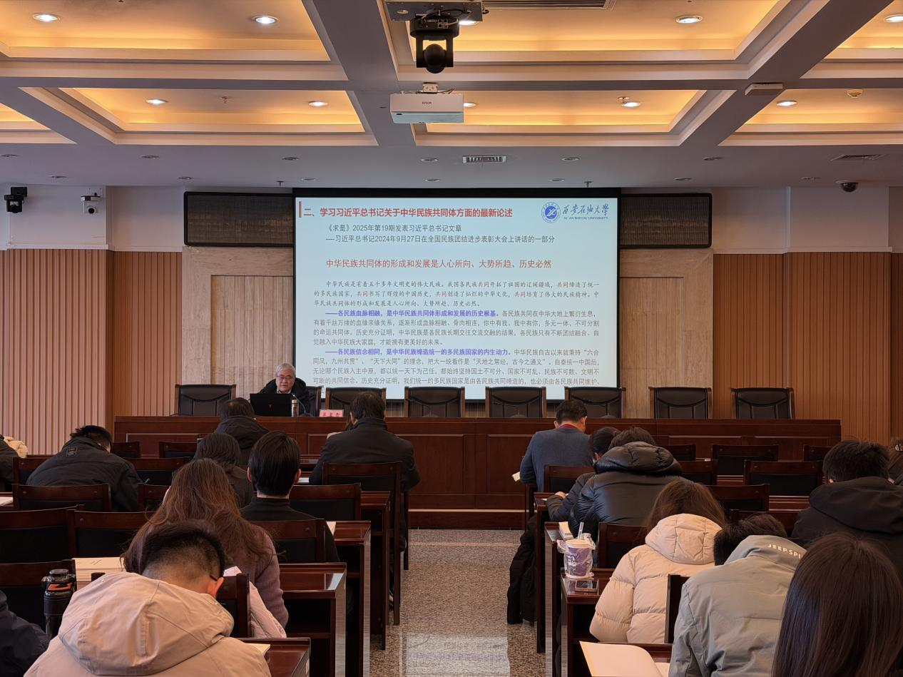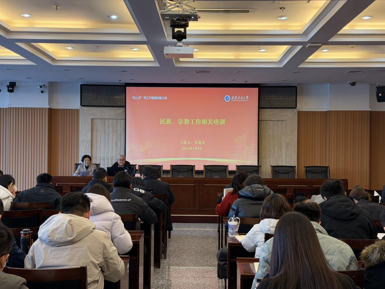 為進一步加強學工干部隊伍建設,提升我校民族宗教工作規(guī)范化水平,筑牢校園意識形態(tài)安全防線,1月9日上午,我?!拌F人式”學工干部培訓第八講在鄠邑校區(qū)圖書館第一會議室舉行。校黨委委員、黨委統(tǒng)戰(zhàn)部部長吳復雷以《加強鑄牢中華民族共同體意識教育、堅持我國宗教中國化、做好學校民族宗教工作》為題作專題輔導報告。學生工作部副部長畢軼慧主持培訓會,黨委統(tǒng)戰(zhàn)部、黨委學生工作部、研究生工作部、團委及各院(系)學工干部100余人參加培訓。