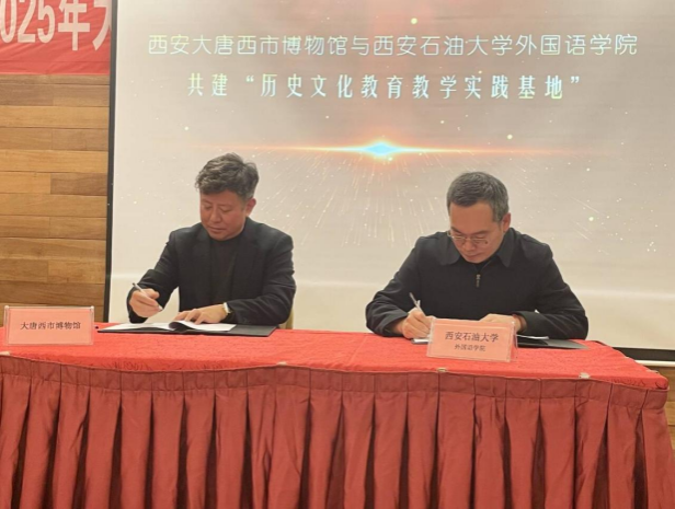 1月10日,外國(guó)語(yǔ)學(xué)院與西安大唐西市博物館共建“歷史文化教育教學(xué)實(shí)踐基地”簽約暨揭牌儀式在西安大唐西市博物館舉行。西安大唐西市博物館館長(zhǎng)董文強(qiáng)、副館長(zhǎng)張瑩,外國(guó)語(yǔ)學(xué)院黨委書(shū)記張建高等人參加簽約和揭牌儀式。