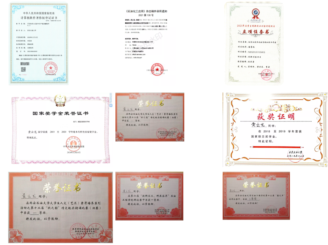 “喜歡不是能力,堅(jiān)持才是能力。”黃云龍先后獲得過第十屆“挑戰(zhàn)杯”陜西省大學(xué)生創(chuàng)業(yè)計(jì)劃競賽銅獎、第五屆“互聯(lián)網(wǎng)+”大學(xué)生創(chuàng)新創(chuàng)業(yè)大賽陜西省銅獎、第七屆“互聯(lián)網(wǎng)+”大學(xué)生創(chuàng)新創(chuàng)業(yè)大賽陜西省銀獎、首屆海洋工程設(shè)計(jì)大賽知識競賽三等獎等多個獎項(xiàng)。此外,他在2020年參加的大學(xué)生創(chuàng)新創(chuàng)業(yè)項(xiàng)目被立為國家級項(xiàng)目,還與老師共同取得“不同完井方式的氣井產(chǎn)能求解軟件V1.0”軟件著作權(quán),這些都不可謂收獲不豐。