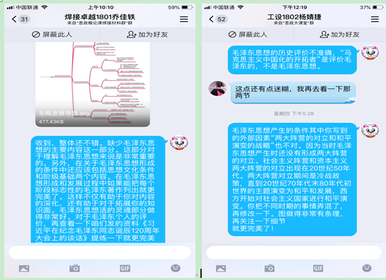 課后,郭老師利用QQ群對(duì)學(xué)生進(jìn)行及時(shí)的輔導(dǎo)和交流,及時(shí)關(guān)注學(xué)生對(duì)教學(xué)效果的反饋。針對(duì)學(xué)生的差異性,她還布置了個(gè)性化和自主性的作業(yè),實(shí)現(xiàn)了一對(duì)一的輔導(dǎo)。學(xué)生除必須完成的作業(yè)外,還布置了可以自主選擇性的作業(yè)。如通過思維導(dǎo)圖的方式梳理所學(xué)內(nèi)容的作業(yè),疫情之下的線上教學(xué)學(xué)生學(xué)習(xí)的效果如何,通過思維導(dǎo)圖對(duì)所學(xué)內(nèi)容進(jìn)行梳理,可以及時(shí)了解學(xué)生對(duì)教學(xué)內(nèi)容的掌握情況,同時(shí)也有助于提升學(xué)生的邏輯思維能力和概括能力。課后針對(duì)學(xué)生所做的思維導(dǎo)圖,進(jìn)行一對(duì)一的指導(dǎo),再把學(xué)生的作業(yè)發(fā)到學(xué)生QQ群中,鼓勵(lì)引導(dǎo)更多的學(xué)生積極參與。用自主性作業(yè)的方式和一對(duì)一的指導(dǎo),滿足了多層次學(xué)生的需求,教學(xué)效果較好。如品讀馬克思主義經(jīng)典原著,形成PPT進(jìn)行成果匯報(bào)的作業(yè),通過這一作業(yè)形式讓學(xué)生更好的學(xué)經(jīng)典、悟原理、勤思考,讓學(xué)生學(xué)會(huì)用真理的光芒照亮前行的路。