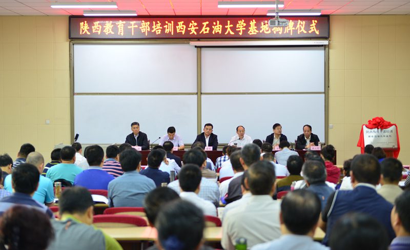 高晶華副巡視員首先宣讀了《中共陜西省委高教工委、陜西省教育廳關(guān)于同意建立陜西教育干部培訓(xùn)西安石油大學(xué)基地的批復(fù)》文件,隨后王紫貴副廳長、屈展校長共同為基地揭牌。