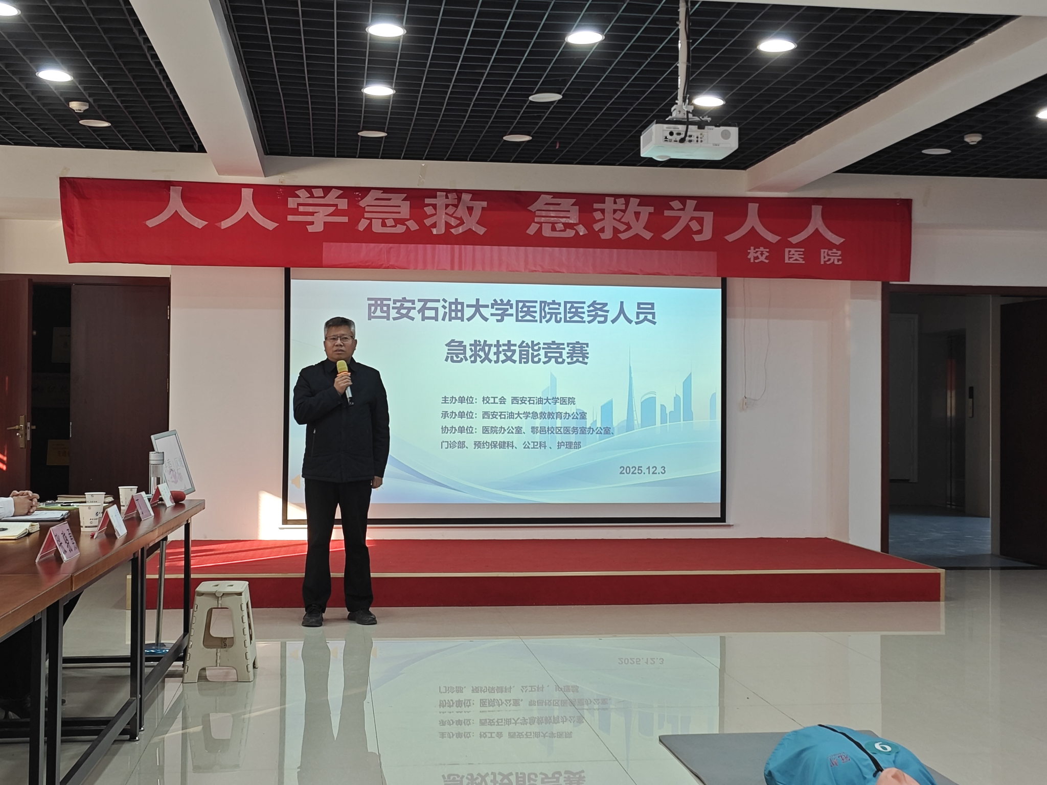 為進一步錘煉醫(yī)務(wù)人員急救專業(yè)素養(yǎng),提升校園應(yīng)急處置工作水平,筑牢師生生命健康安全防線,12月3日,學(xué)校在鄠邑校區(qū)醫(yī)院舉辦醫(yī)務(wù)人員急救技能競賽。副校長張驍勇出席活動并講話,校工會、校醫(yī)院相關(guān)負責(zé)人及全體醫(yī)務(wù)人員參加。