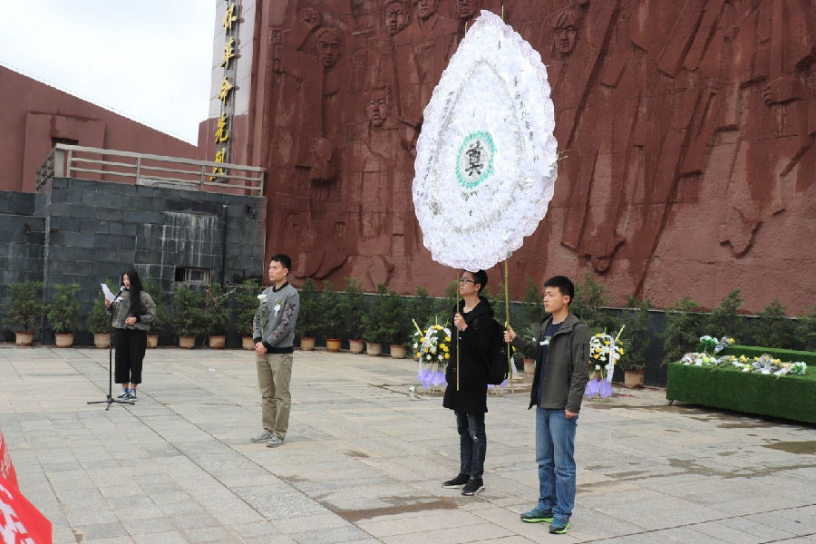 商管類1702班唐穎作為代表致悼詞。她說到,矗立在大家面前的烈士豐碑,訴說著英雄們光榮而無悔的事業(yè),歲月的風(fēng)塵早已在它身上刻下斑駁的印記,讓大家無法不回想起那段滄桑沉重的往事。七百余位革命烈士長眠于此。他們?yōu)樽非缶葒让竦恼胬頀侇^顱,灑熱血;為中華民族的解放事業(yè)前仆后繼,視死如歸。作為新時(shí)代的莘莘學(xué)子,更應(yīng)充滿愛國之情,樹立報(bào)國之心,努力學(xué)習(xí),繼承先烈遺志,為家鄉(xiāng)的建設(shè)、為祖國的富強(qiáng)而努力奮斗。