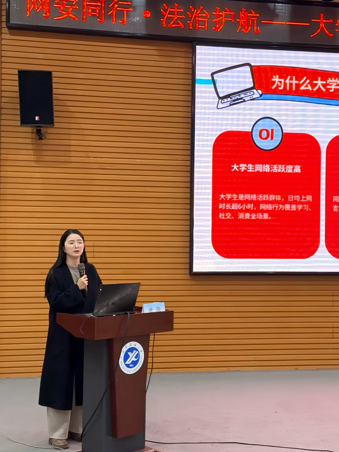 為進(jìn)一步提升我校大學(xué)生網(wǎng)絡(luò)安全意識(shí)和法治素養(yǎng),規(guī)范網(wǎng)絡(luò)行為,營造安全有序的校園網(wǎng)絡(luò)環(huán)境,12月11日下午,學(xué)校在崇文樓118多功能廳舉辦“網(wǎng)安同行·法治護(hù)航——大學(xué)生網(wǎng)絡(luò)行為安全規(guī)范法律知識(shí)講座”。本次活動(dòng)由黨委學(xué)生工作部、武裝部副部長馬小剛主持。