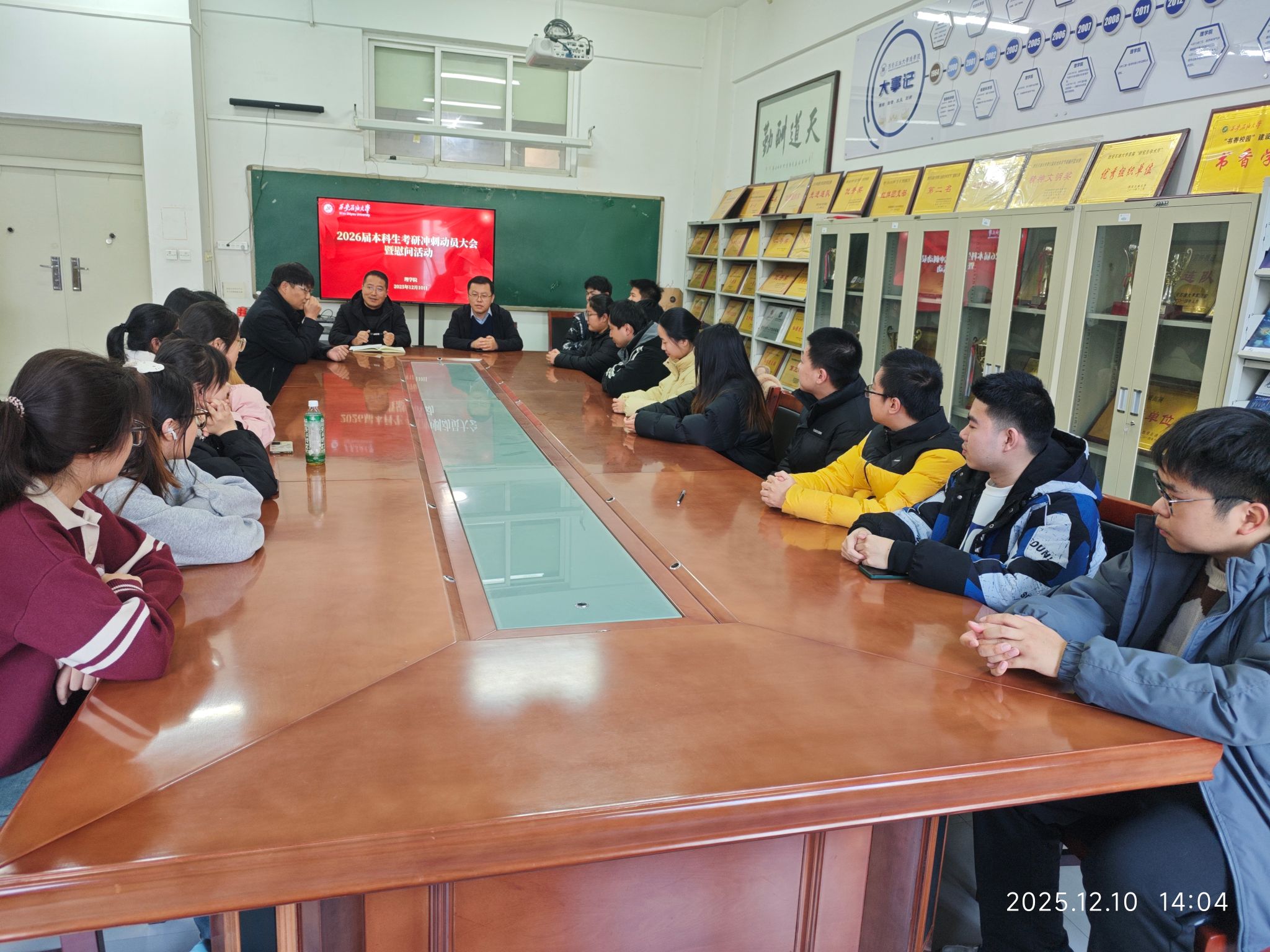 冬日礪劍,蓄勢待發(fā);“研”途護(hù)航,溫暖同行。時(shí)值2026屆研究生考試沖刺攻堅(jiān)的關(guān)鍵節(jié)點(diǎn),為進(jìn)一步激勵(lì)考研學(xué)子堅(jiān)定信念,以最佳狀態(tài)迎戰(zhàn)決勝之戰(zhàn),12月10日下午,理學(xué)院考研沖刺動(dòng)員會暨考研慰問活動(dòng)在鄠邑校區(qū)志遠(yuǎn)樓111會議室舉行。學(xué)院黨政領(lǐng)導(dǎo)席利哲、折延宏、楊富民參加動(dòng)員會,向即將踏上考研征程的考研學(xué)子代表送上暖心關(guān)懷與殷切期許。