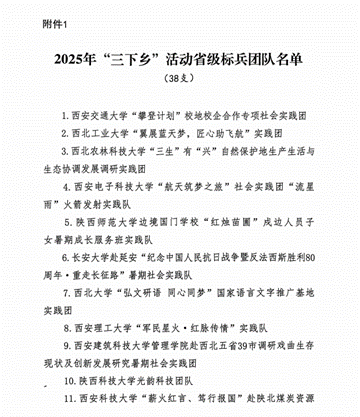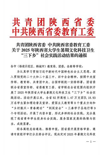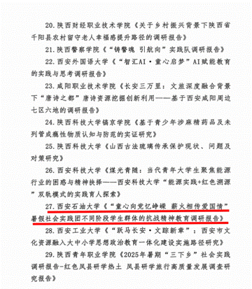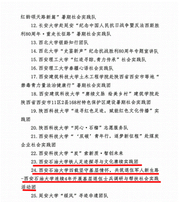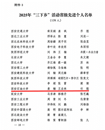 近日,共青團(tuán)陜西省委、中共陜西省委教育工委在全省范圍內(nèi)組織開展的2025年陜西省大學(xué)生暑期文化科技衛(wèi)生“三下鄉(xiāng)”社會(huì)實(shí)踐活動(dòng)評選表彰結(jié)果揭曉,我校電子工程學(xué)院堅(jiān)定禁毒不松懈實(shí)踐團(tuán)隊(duì)被評為省級標(biāo)兵團(tuán)隊(duì),石油工程學(xué)院鐵人足跡探尋與文化賡續(xù)實(shí)踐團(tuán)、機(jī)械工程學(xué)院四載堅(jiān)守基層情懷,共筑退伍軍人新生路—西安石油大學(xué)連續(xù)4年開展基層退伍士兵調(diào)研與幫扶社會(huì)實(shí)踐活動(dòng)團(tuán)被評為省級優(yōu)秀團(tuán)隊(duì),姜楠、王業(yè)林、付強(qiáng)被評為省級先進(jìn)個(gè)人,馬克思主義學(xué)院《童心向黨憶崢嶸薪火相傳愛國情暑假社會(huì)實(shí)踐團(tuán)不同階段學(xué)生群體的抗戰(zhàn)精神教育調(diào)研報(bào)告》被評為省級優(yōu)秀調(diào)研報(bào)告,并獲團(tuán)省委專項(xiàng)資助。
