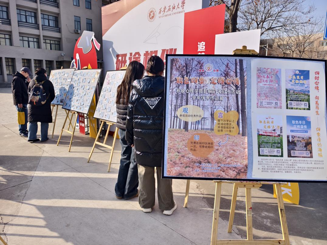 2025年12月19日,“取色四季 定格心情”積極心理學(xué)微影響21天打卡系列活動(dòng)全年優(yōu)秀作品展在我校崇文樓東北角江漢林廣場(chǎng)舉辦。學(xué)生工作部(處)(學(xué)生心理成長(zhǎng)指導(dǎo)中心)、人文學(xué)院相關(guān)工作負(fù)責(zé)人出席活動(dòng)。