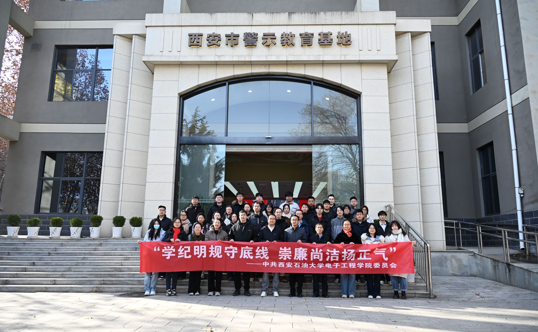 為扎實(shí)推進(jìn)學(xué)校警示教育暨紀(jì)律教育學(xué)習(xí)宣傳月活動(dòng)安排,增強(qiáng)師生黨員的紀(jì)律意識(shí)、規(guī)矩意識(shí)和廉潔自律意識(shí),電子工程學(xué)院黨委緊扣“學(xué)紀(jì)明規(guī)守底線,崇廉尚潔揚(yáng)正氣”主題,于12月24日下午組織師生黨員代表前往西安市警示教育基地,開(kāi)展了一場(chǎng)嚴(yán)肅深刻的現(xiàn)場(chǎng)警示教育活動(dòng)。學(xué)院領(lǐng)導(dǎo)班子成員、教工黨支部支部委員、近三年新入職教師以及研究生黨員代表等共計(jì)40人參加了此次活動(dòng),活動(dòng)由學(xué)院黨委副書(shū)記、紀(jì)檢委員芮執(zhí)根帶隊(duì)。