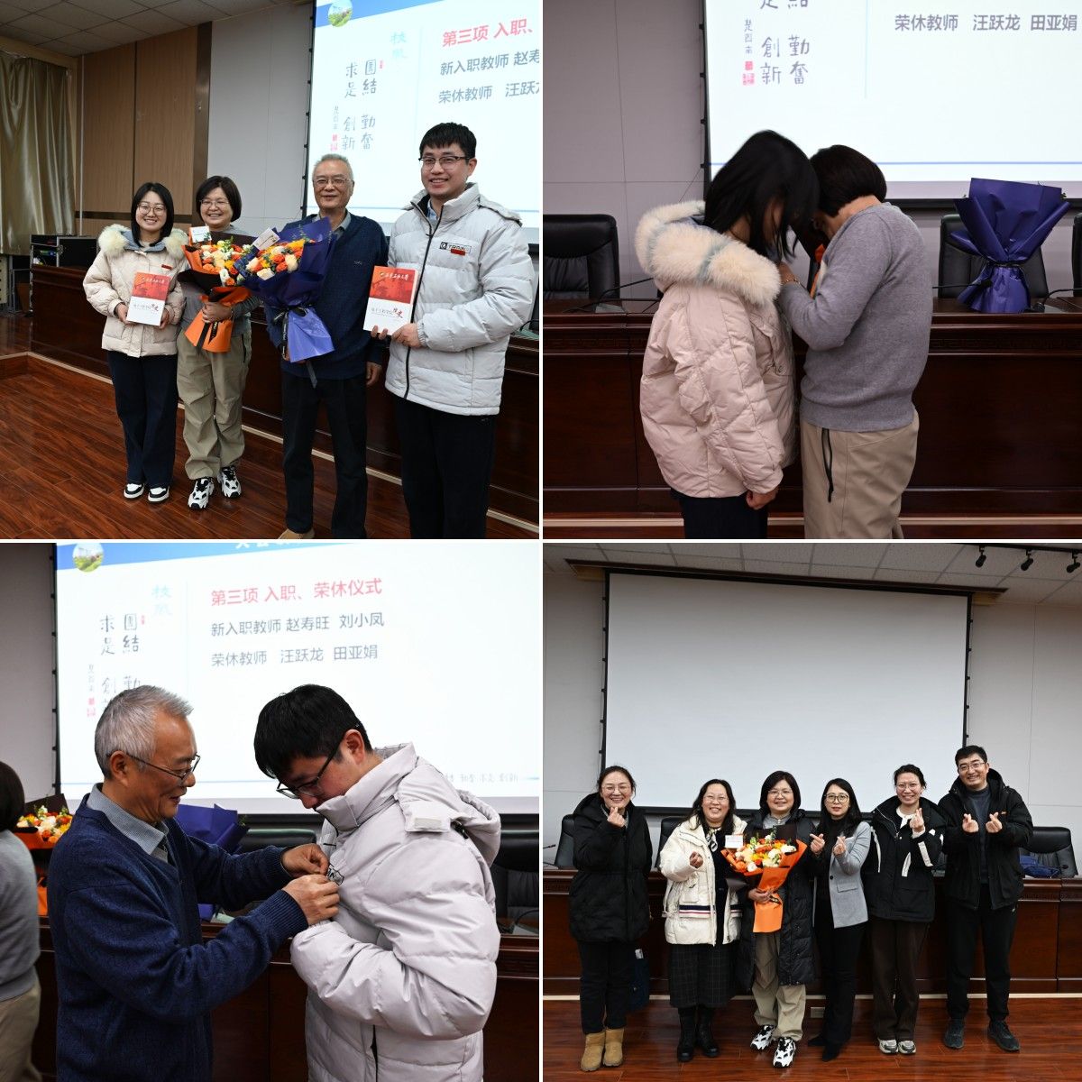 在大會第三項溫馨而莊重的入職與榮休儀式中,新入職教師趙壽旺、劉小鳳受到熱烈歡迎,退休教師汪躍龍、田亞娟在掌聲中接受敬意與祝福,并親自為新教師佩戴?;铡①浰驮菏?,象征學(xué)院精神薪火相傳。學(xué)院對榮休教師多年來為學(xué)院發(fā)展作出的貢獻表示衷心感謝,并鼓勵新教師傳承學(xué)院優(yōu)良傳統(tǒng),續(xù)寫事業(yè)發(fā)展新篇章。