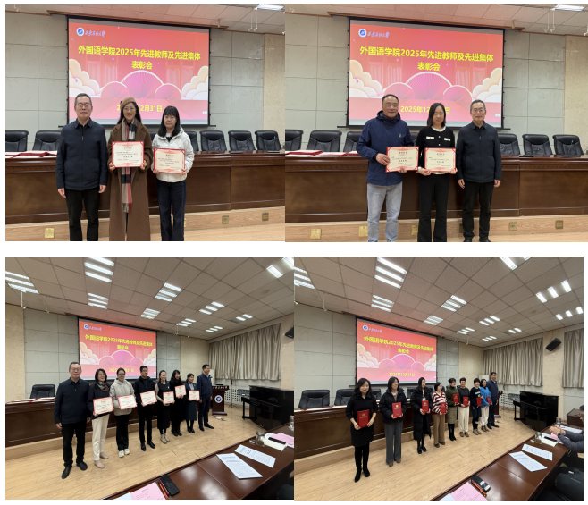 在述職述廉會議之后,學院召開2025年先進教師和先進集體的表彰大會,陳武宣讀了《外國語學院關于公布2025年度先進教師及先進集體評選結果的通知》,對在教育教學、科學研究、人才培養(yǎng)、管理服務等工作中表現突出的4個先進集體和29名先進教師予以隆重表彰。學院黨政領導和工會主席為獲獎集體與個人頒發(fā)榮譽證書,陳武向受表彰的先進集體和先進教師表示熱烈祝賀,他們身上愛崗敬業(yè)、甘于奉獻的精神,值得全體教師學習借鑒,全體教師要以先進為標桿、以榜樣為力量、主動對標看齊,為學院發(fā)展貢獻自己的力量。