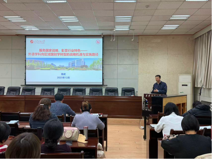 隨后,副院長(zhǎng)陳武做全院教學(xué)科研工作動(dòng)員,并就“服務(wù)國(guó)家戰(zhàn)略,彰顯行業(yè)特色——外語(yǔ)學(xué)科向區(qū)域國(guó)別學(xué)轉(zhuǎn)型的戰(zhàn)略機(jī)遇與實(shí)施路徑”進(jìn)行專(zhuān)題報(bào)告。報(bào)告深入分析人工智能時(shí)代外語(yǔ)學(xué)科面臨的挑戰(zhàn)與機(jī)遇,明確指出在科技革新和國(guó)家戰(zhàn)略需求升級(jí)的雙重驅(qū)動(dòng)下,外語(yǔ)學(xué)科須突破傳統(tǒng)語(yǔ)言技能培養(yǎng)的局限,深化“外語(yǔ)+能源”復(fù)合型人才培養(yǎng)方向,尋求外語(yǔ)學(xué)科向區(qū)域國(guó)別學(xué)科的轉(zhuǎn)型。他強(qiáng)調(diào),學(xué)院將依托學(xué)校能源學(xué)科優(yōu)勢(shì)和“一帶一路”區(qū)位特征,聚焦中亞、中東等能源富集區(qū)的國(guó)別區(qū)域研究,推動(dòng)外語(yǔ)學(xué)科與能源、法律、國(guó)際傳播等領(lǐng)域的深度融合,逐步構(gòu)建起“學(xué)科為根、行業(yè)為體、戰(zhàn)略為魂”的特色發(fā)展格局。