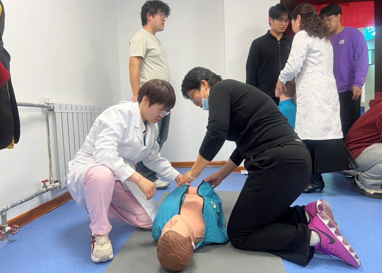 理論學習結(jié)束后,參訓師生分組進入實操演練環(huán)節(jié)。在校醫(yī)院急救團隊手把手指導下,大家圍繞心肺復蘇、AED規(guī)范使用等內(nèi)容反復練習。講師逐一糾正按壓姿勢、發(fā)力方式、呼吸配合、電極片粘貼等細節(jié),確保動作標準、流程規(guī)范。學員們認真投入、勤于實踐,在沉浸式訓練中熟練掌握急救要領,真正實現(xiàn)“聽得懂、學得會、用得上”,為應對校園突發(fā)情況筑牢實戰(zhàn)能力。